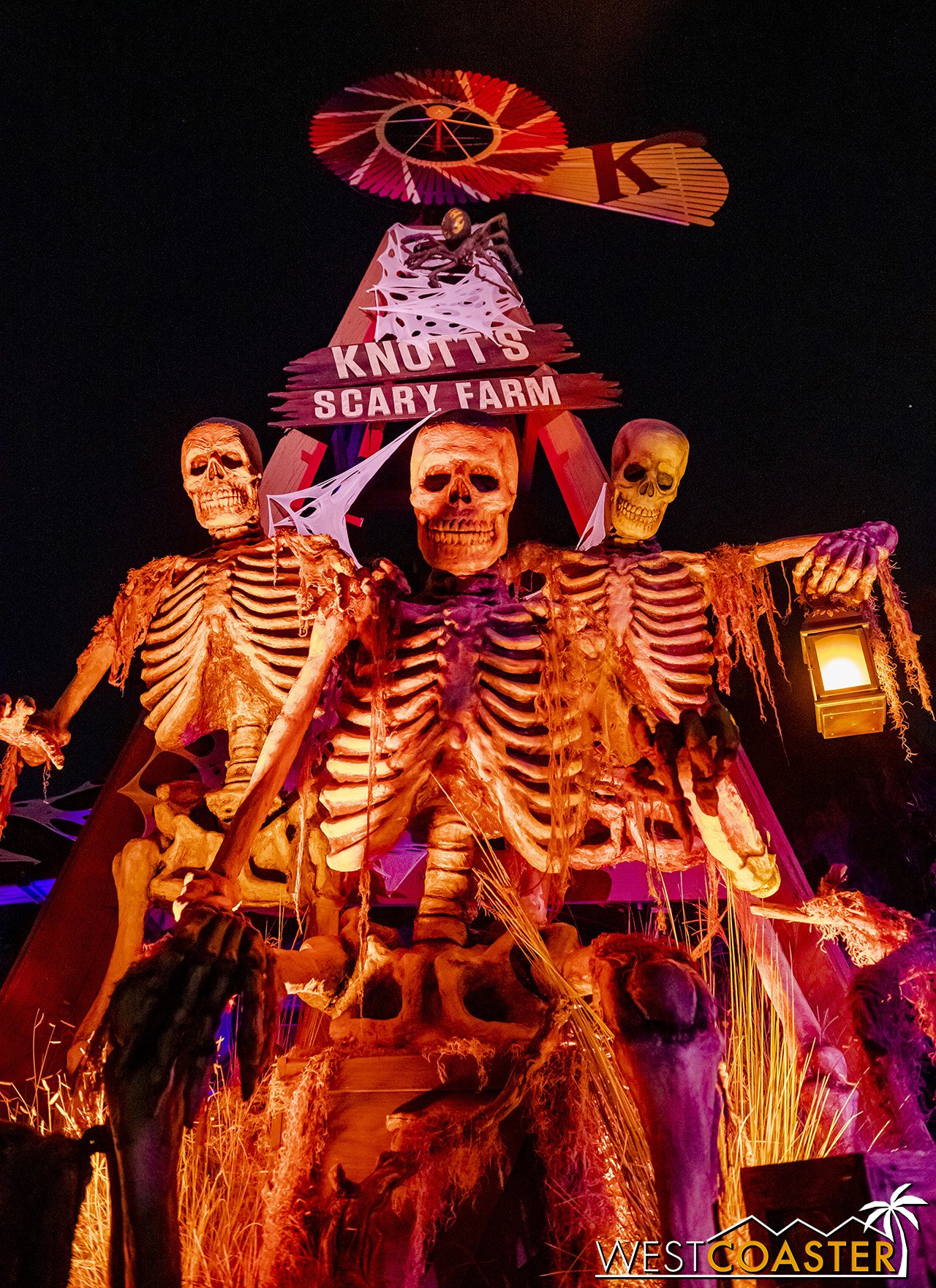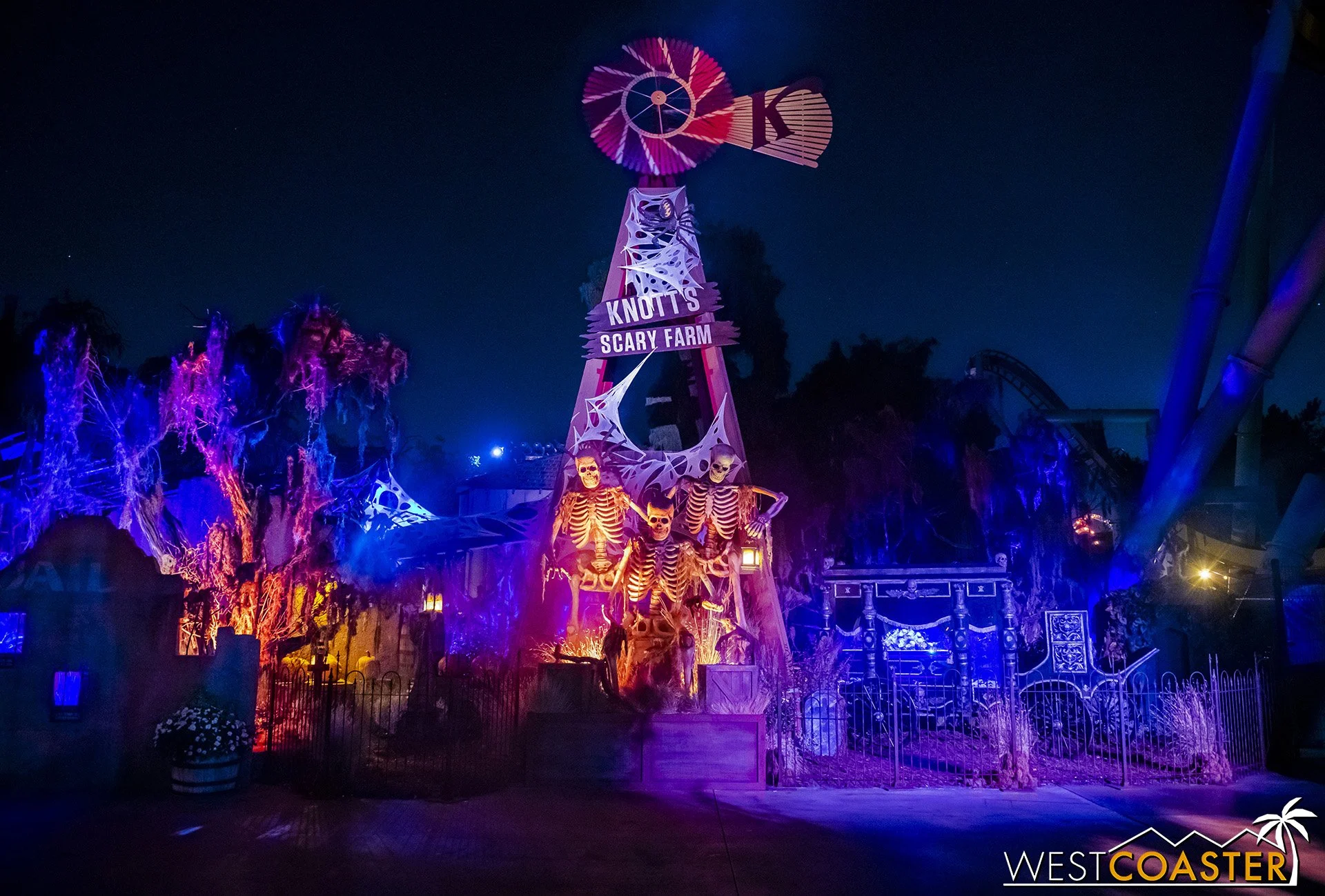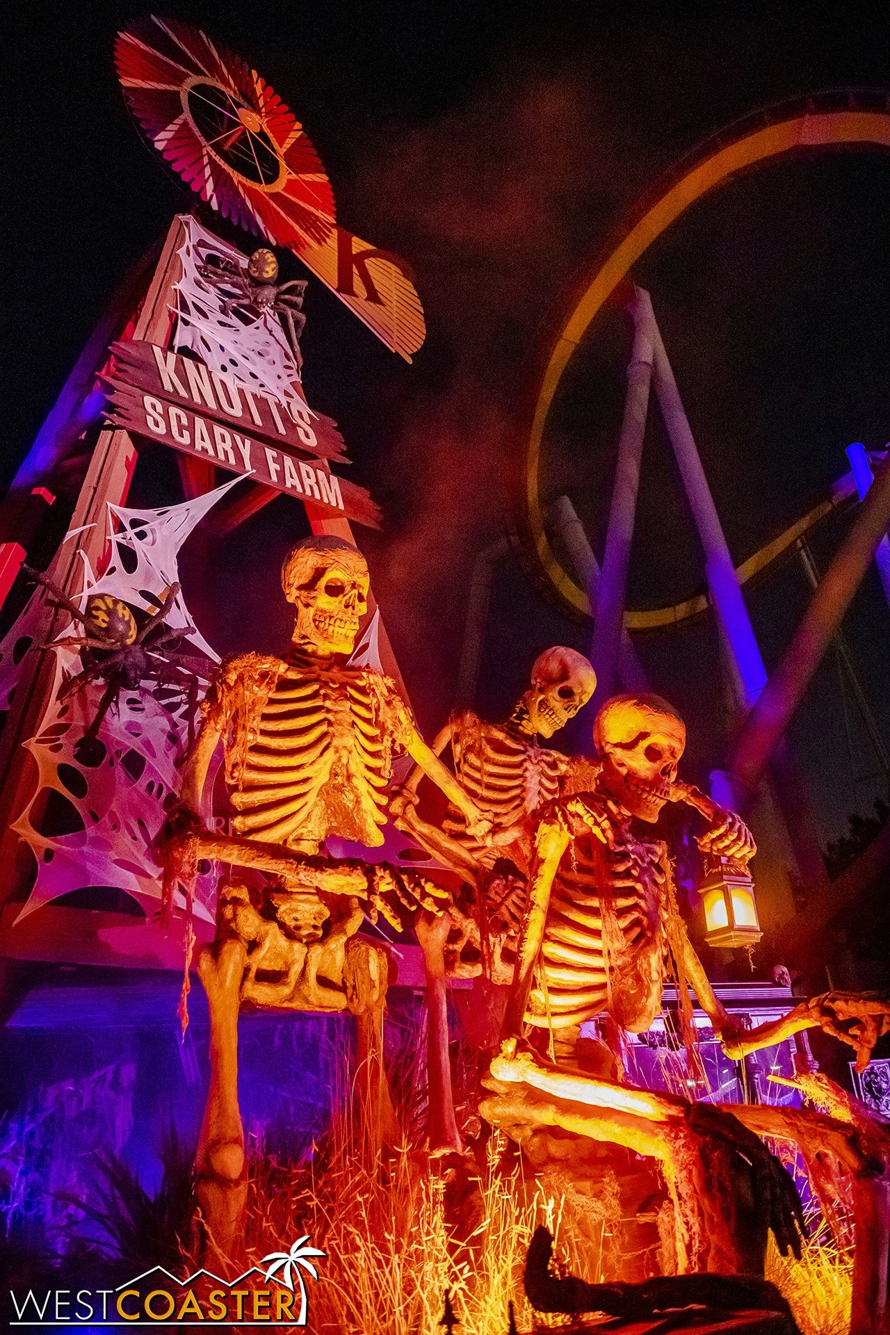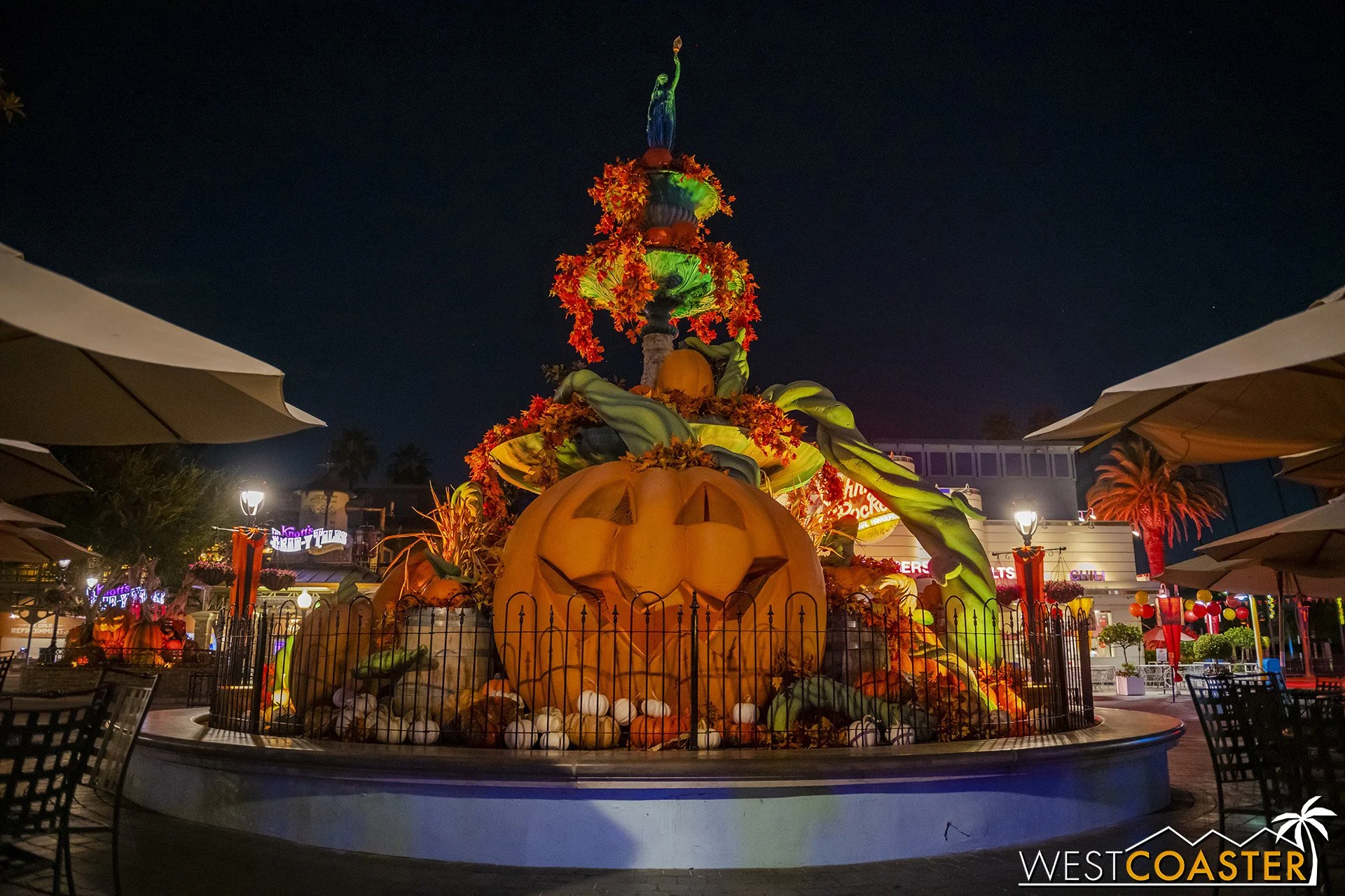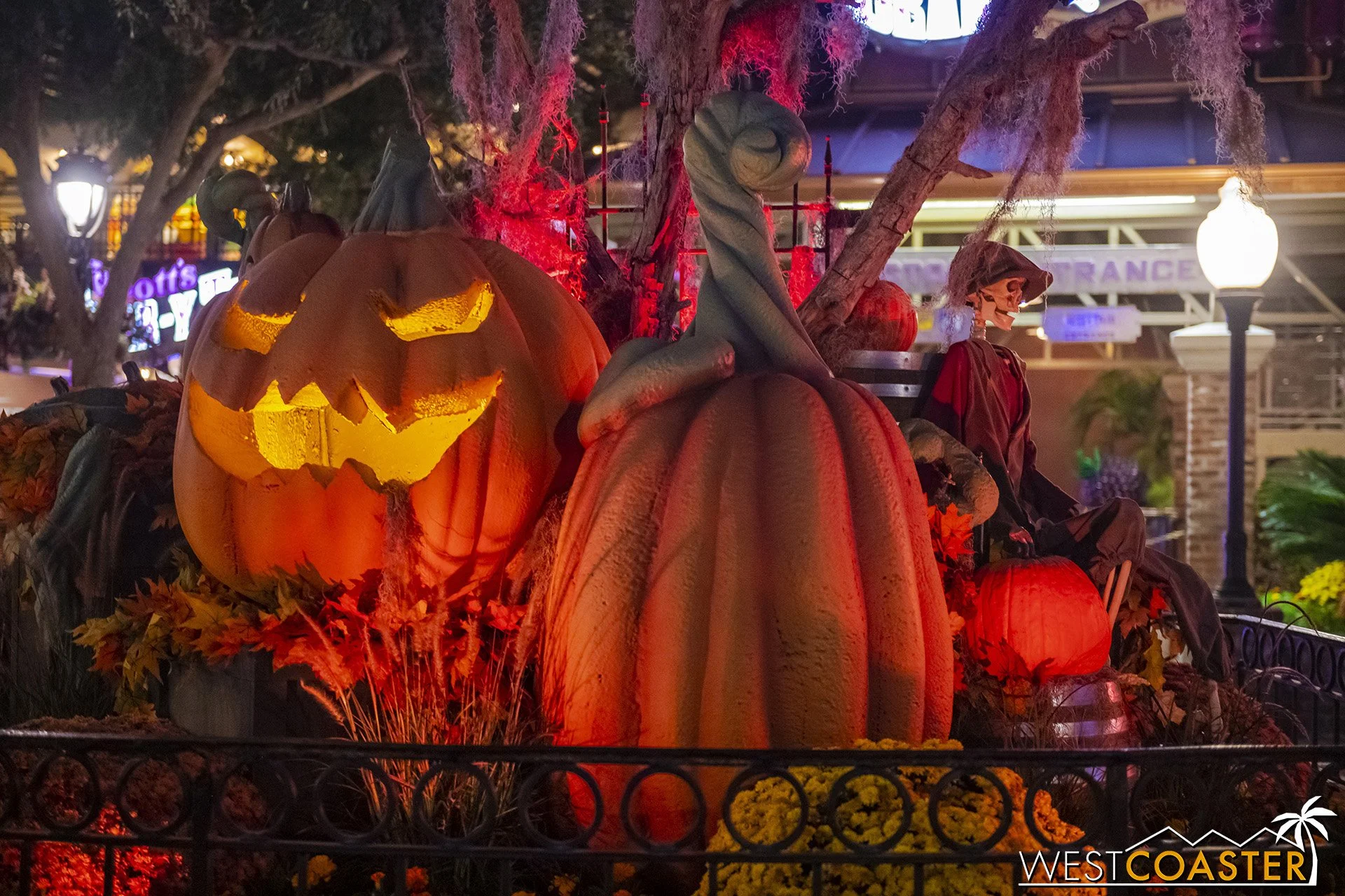 Lastly, we’ll close the update with some photos of the beautiful front gate entry area. Knott’s had been changing this up every year, but the current set-up is pretty iconic and has remained generally the same—dominated by the trio of towering skeletons (long before Home Depot made them commonplace) and a gravely setting. It’s a regular photo op spot throughout the night and after park closing, much like Sleeping Beauty Castle at Disneyland—if only that castle was made of bones!
