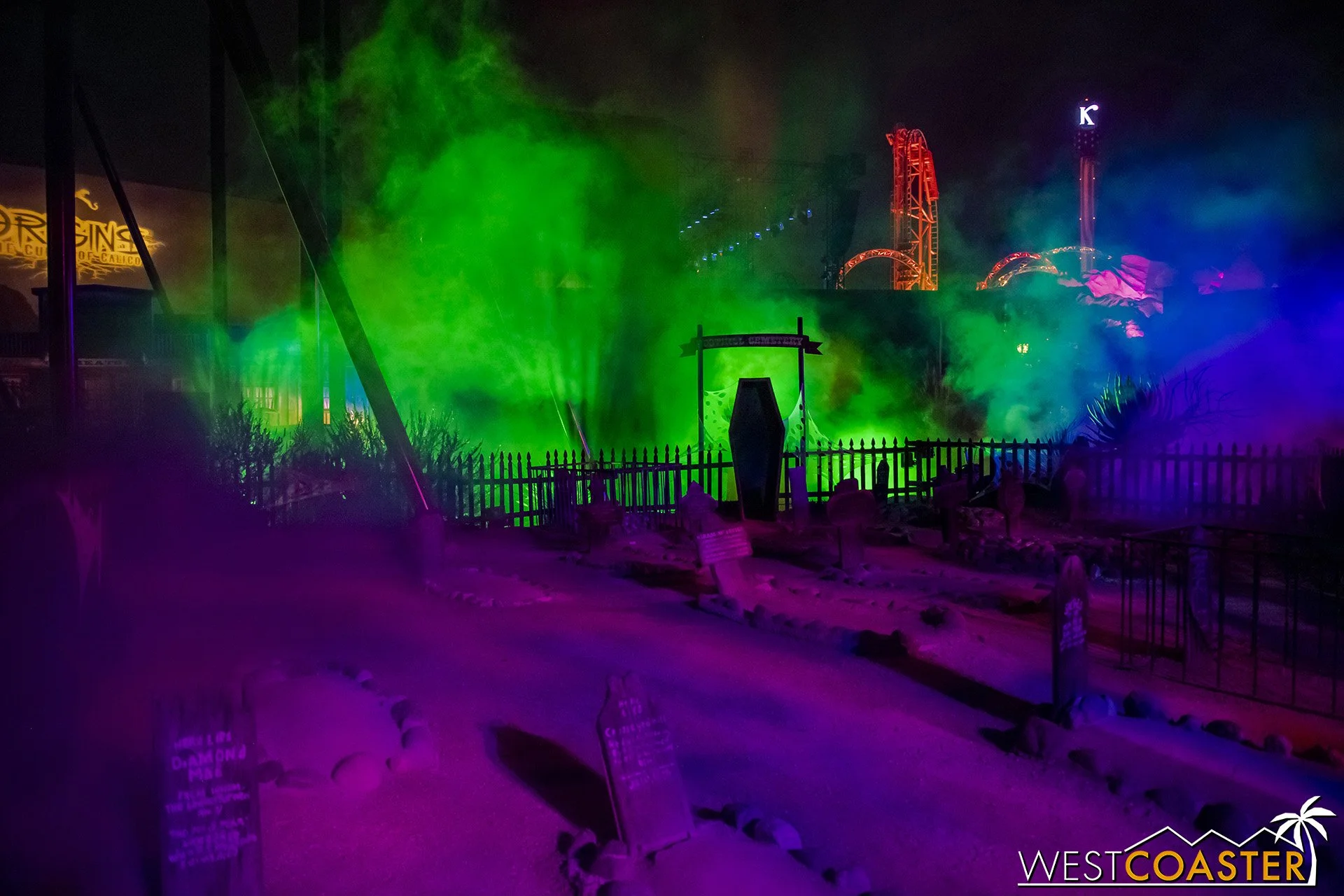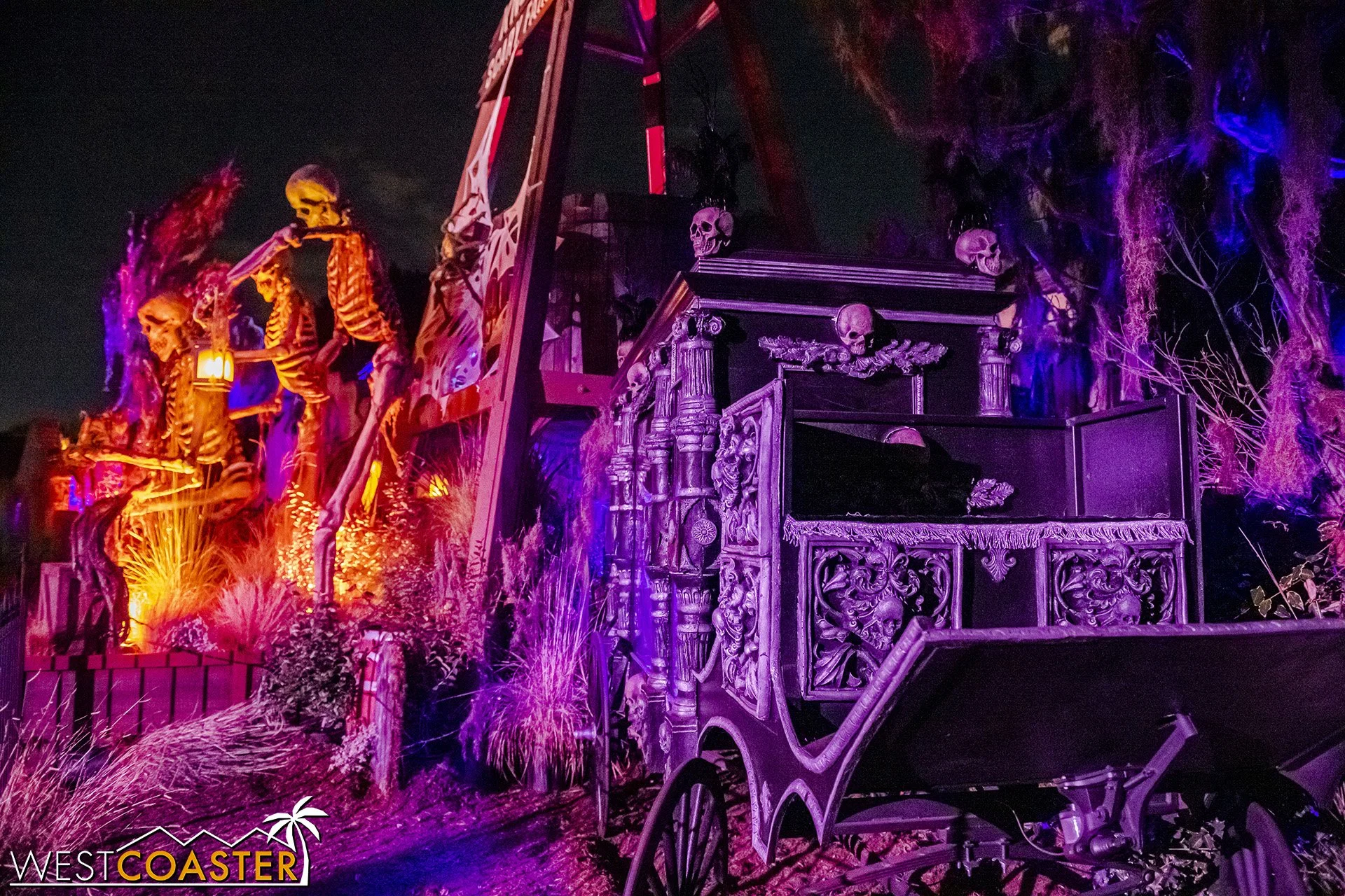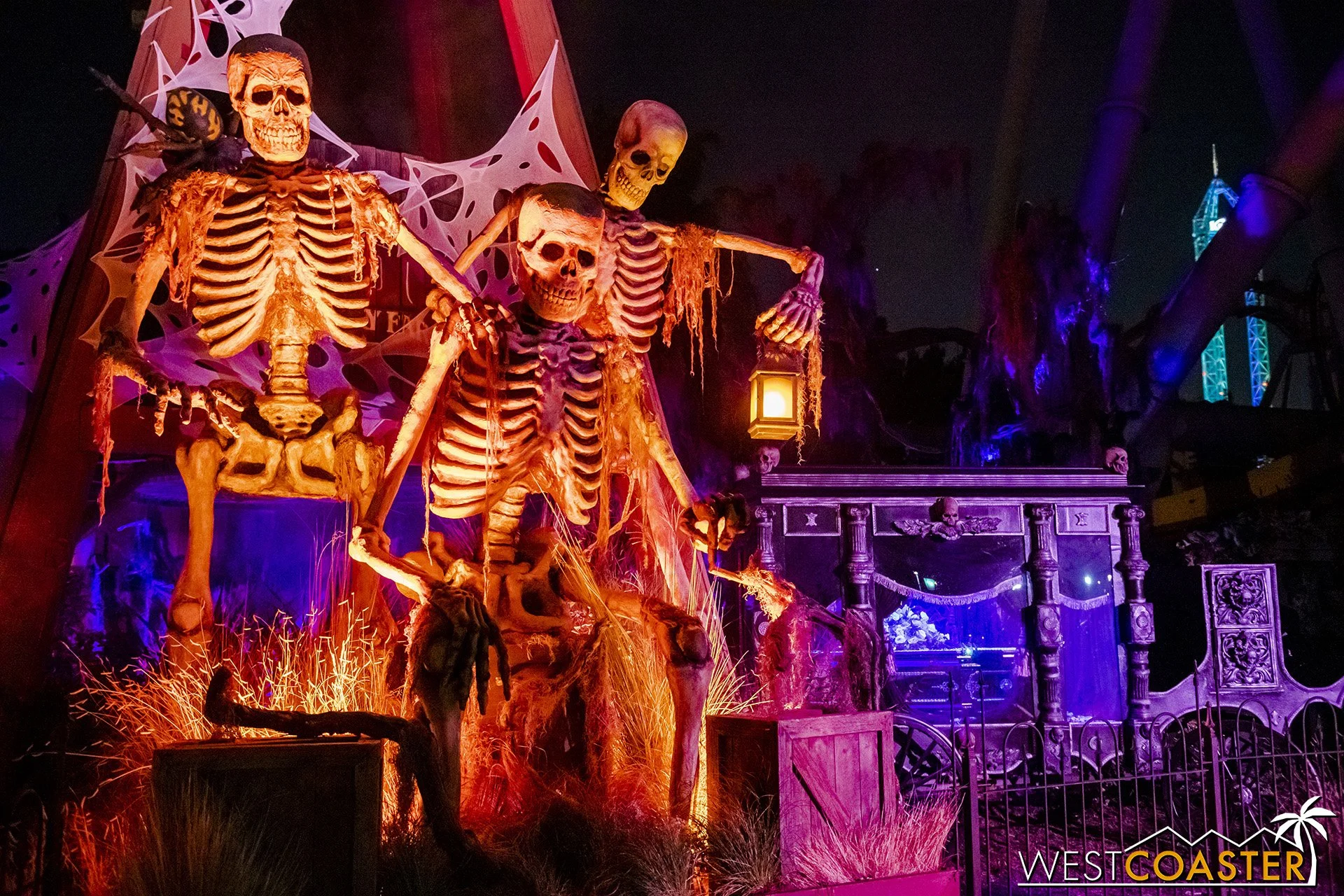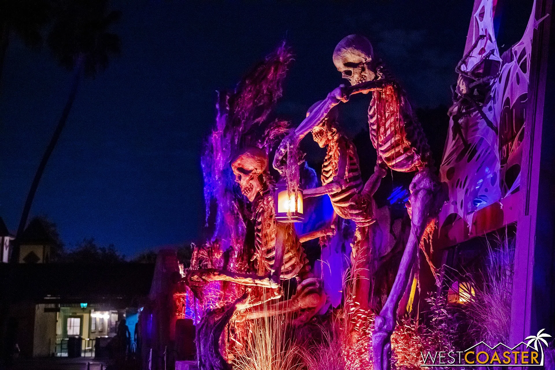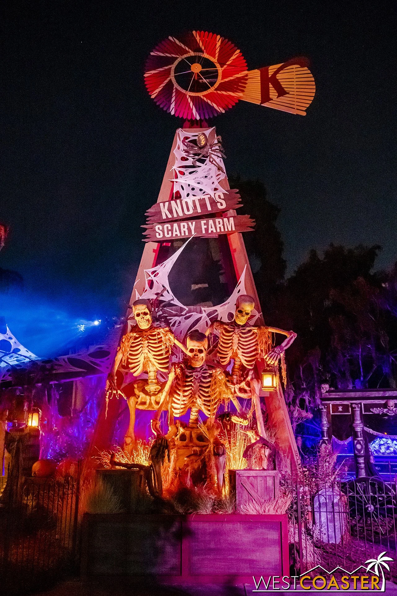 Lastly, we’ll close the update with some photos of the beautiful front gate entry area. Knott’s had been changing this up every year, but the current set-up is pretty iconic and has remained generally the same—dominated by the trio of towering skeletons (long before Home Depot made them commonplace) and a gravely setting. It’s a regular photo op spot throughout the night and after park closing, much like Sleeping Beauty Castle at Disneyland—if only that castle was made of bones!