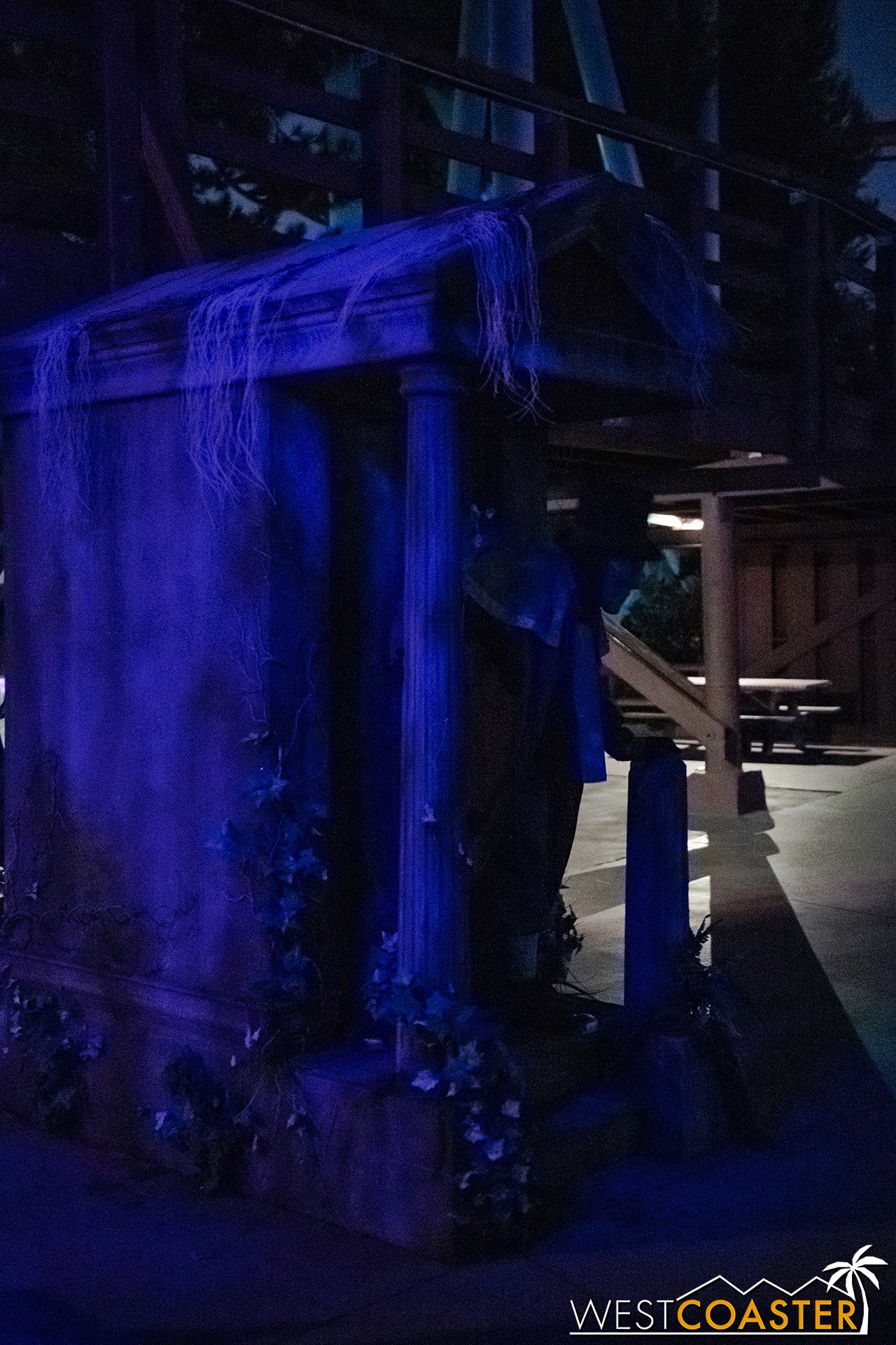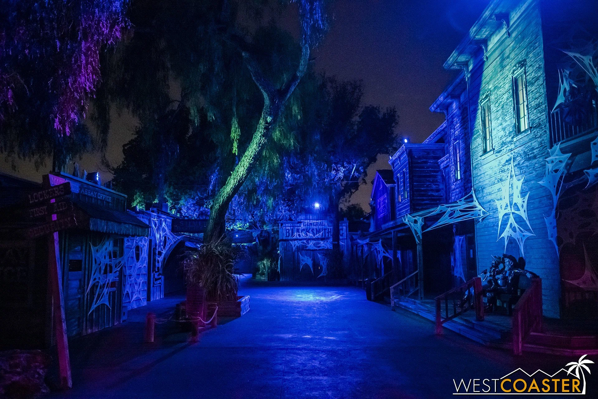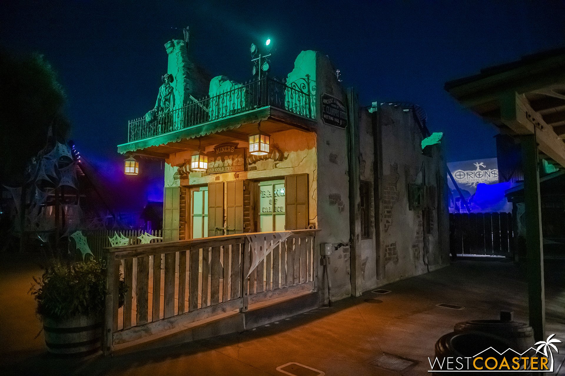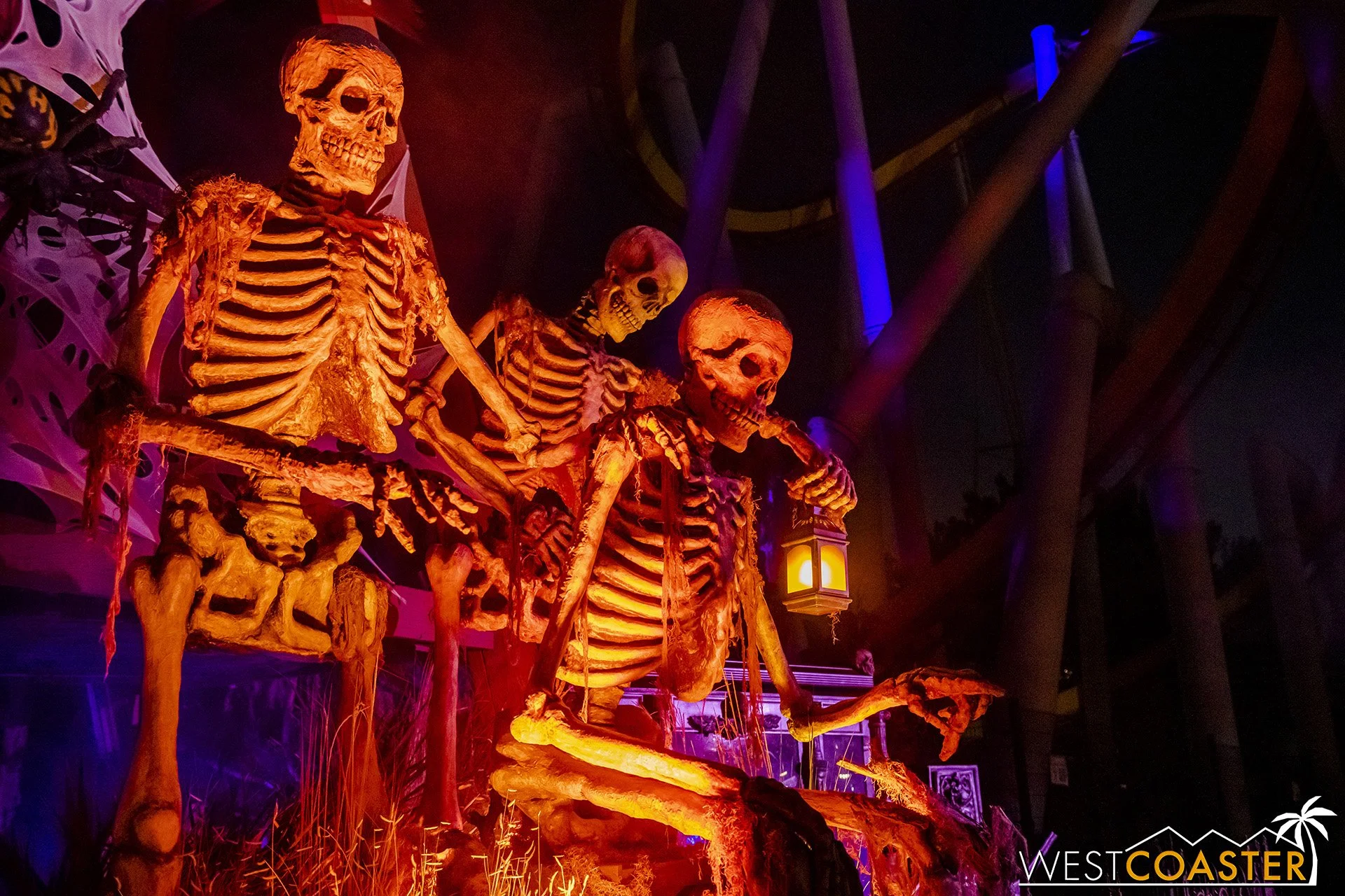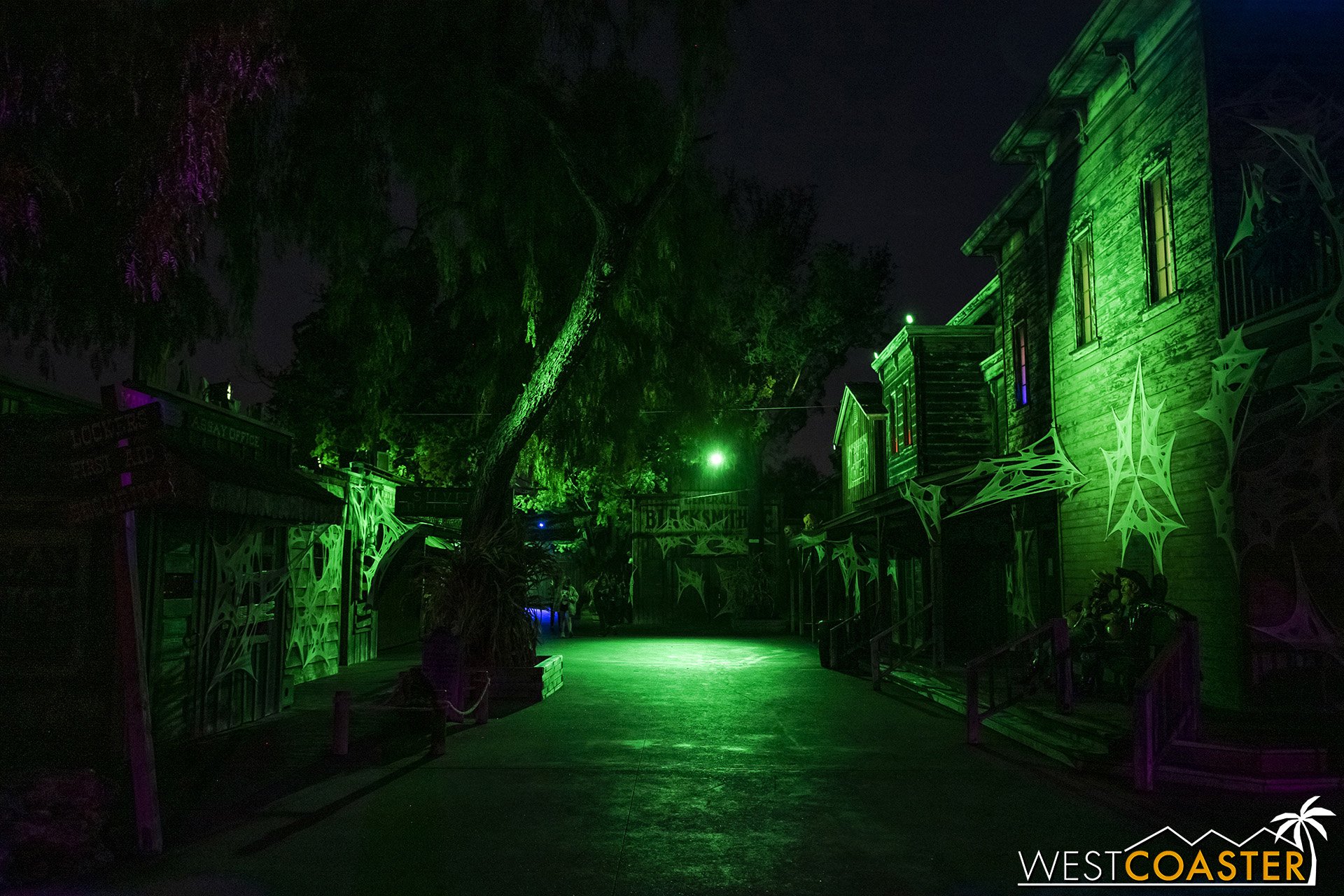 Lastly, we’ll close the update with some photos of the beautiful front gate entry area. Knott’s had been changing this up every year, but the current set-up is pretty iconic and has remained generally the same—dominated by the trio of towering skeletons (long before Home Depot made them commonplace) and a gravely setting. It’s a regular photo op spot throughout the night and after park closing, much like Sleeping Beauty Castle at Disneyland—if only that castle was made of bones!