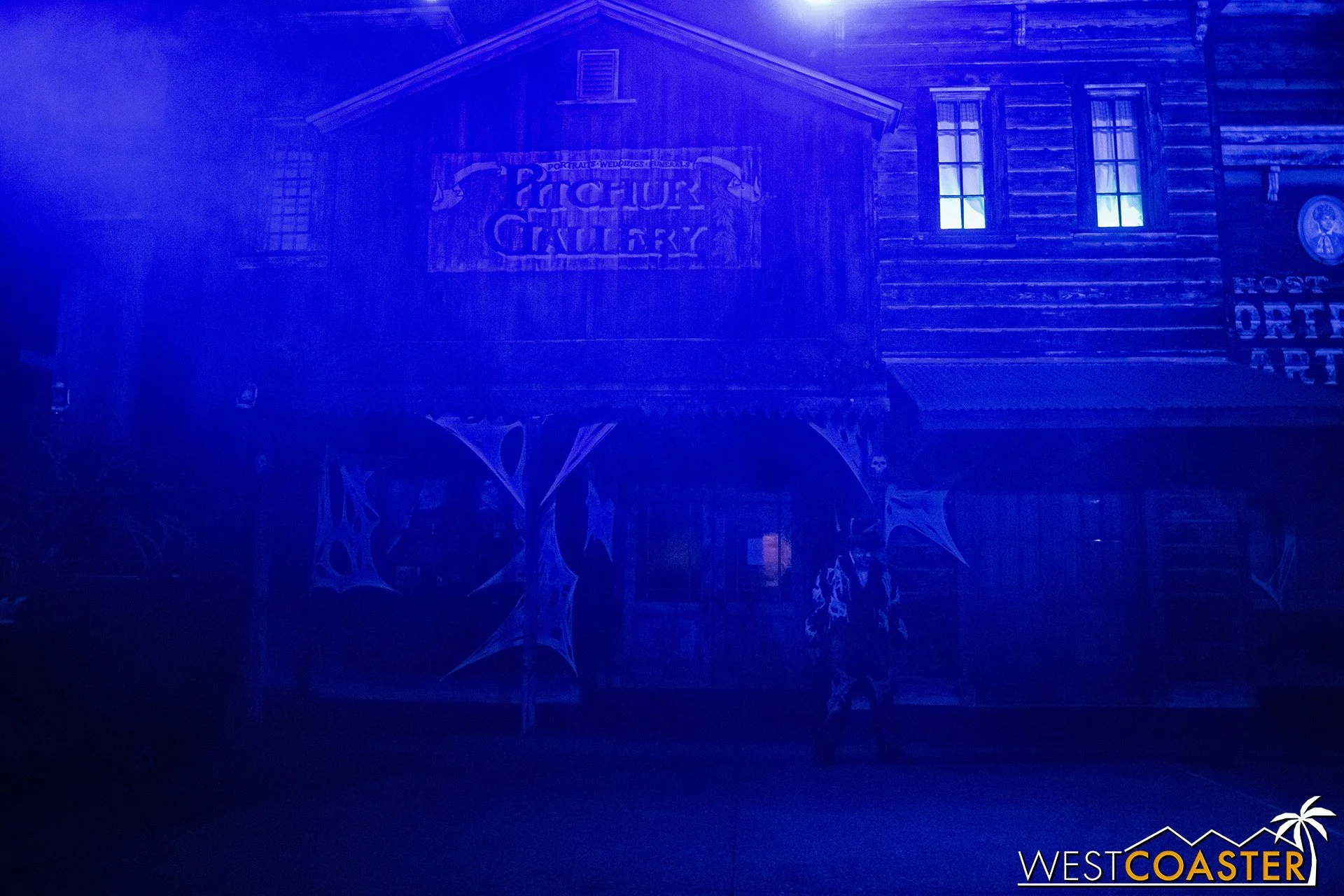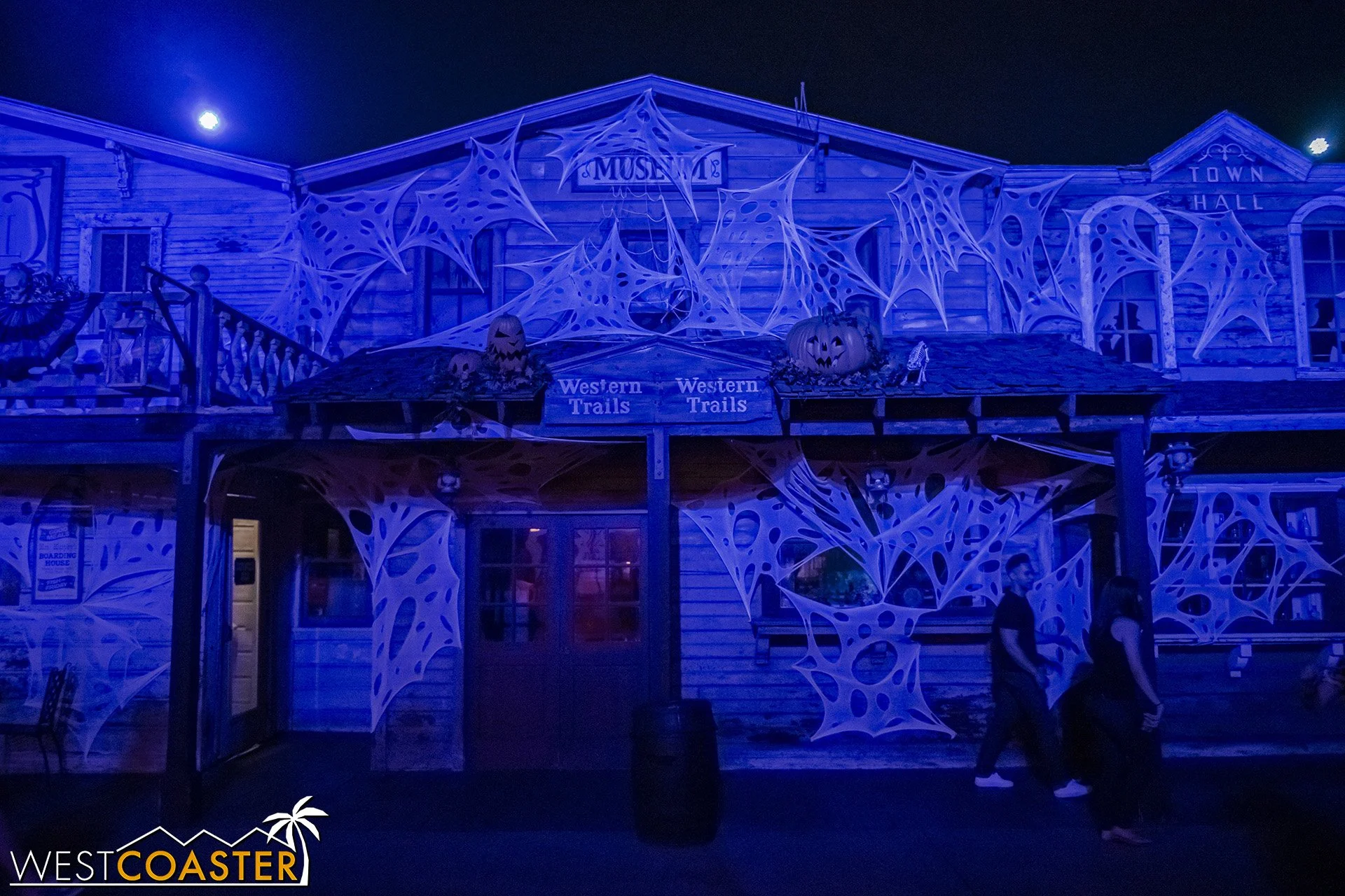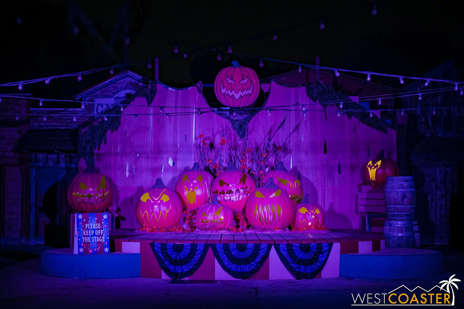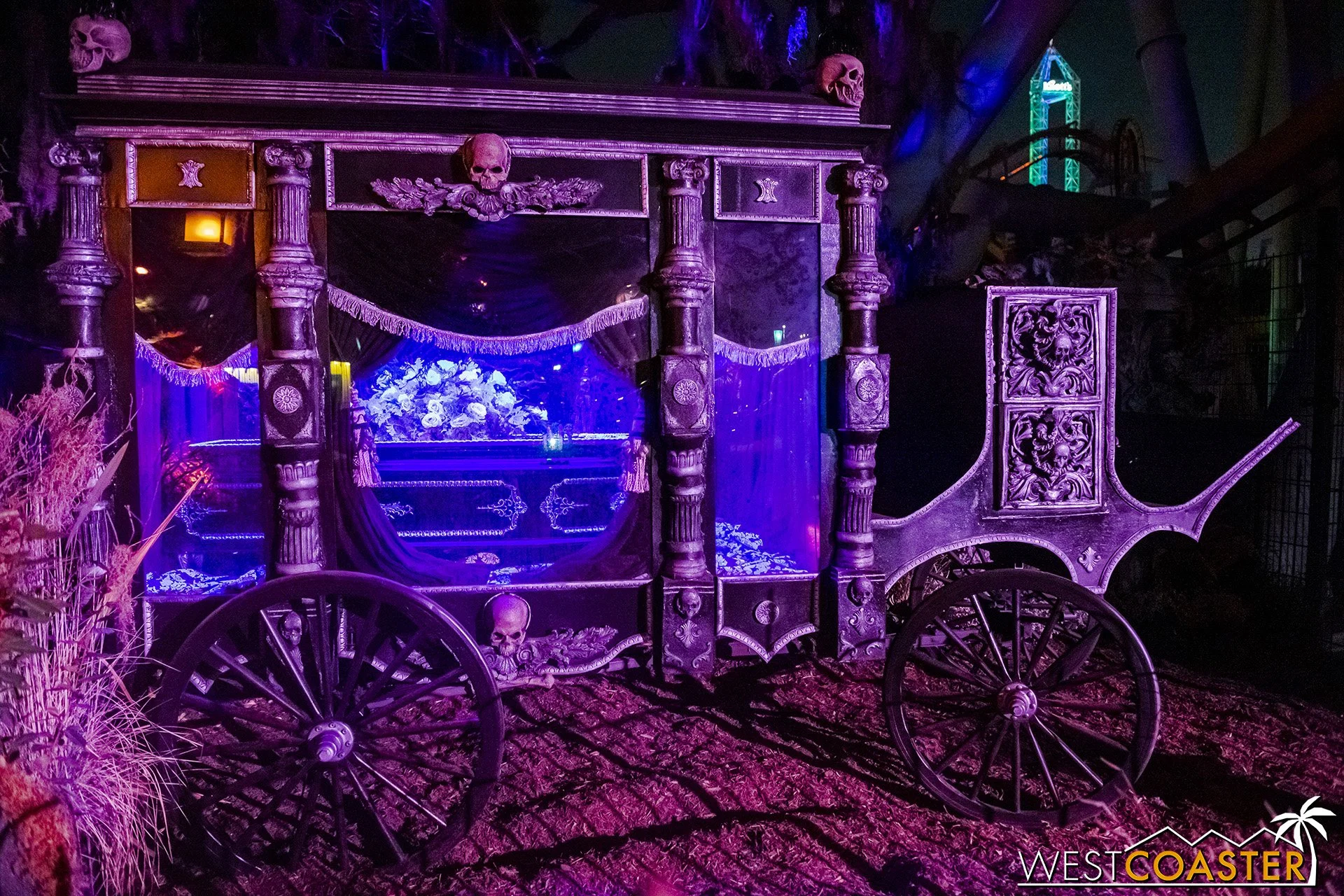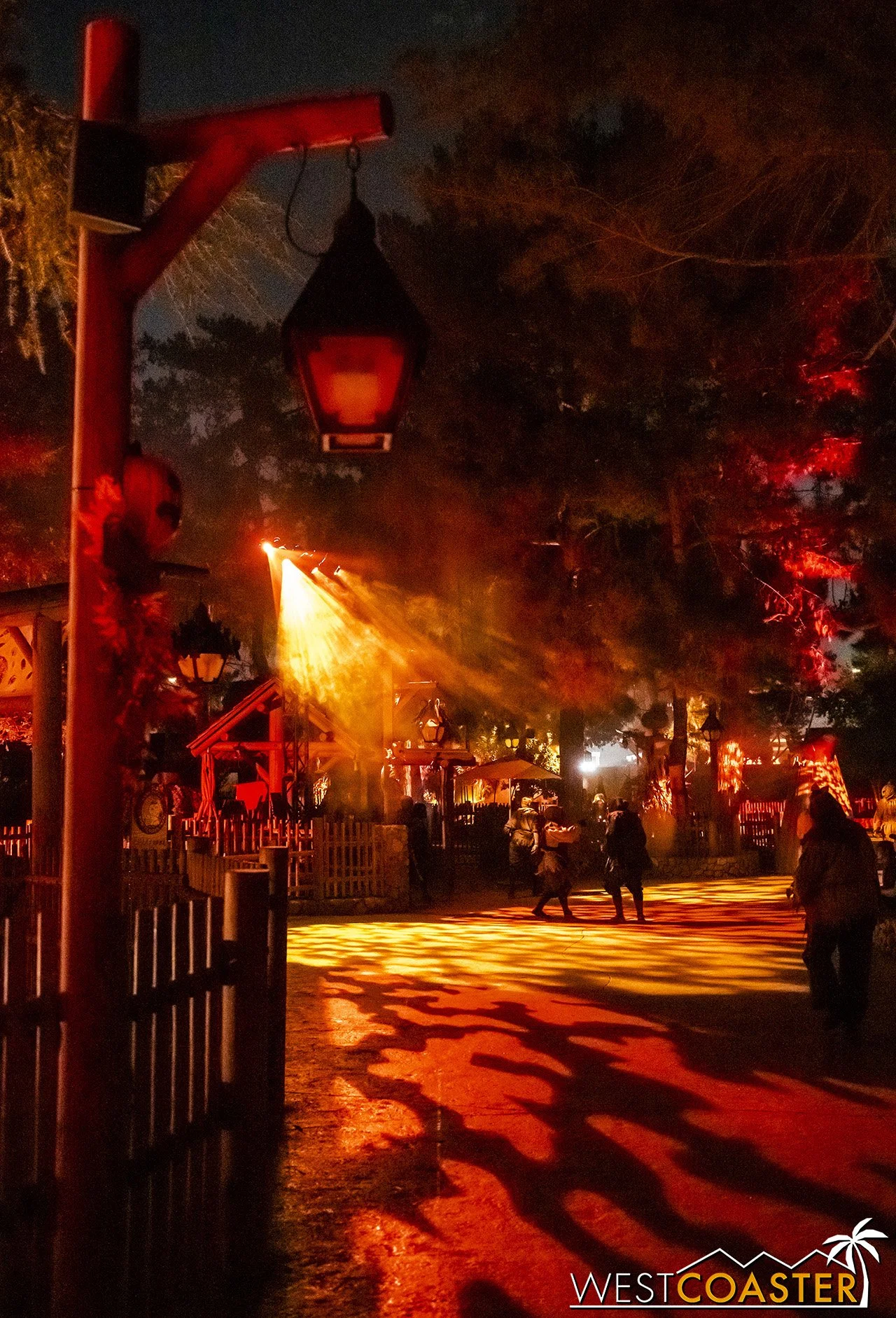 Lastly, we’ll close the update with some photos of the beautiful front gate entry area. Knott’s had been changing this up every year, but the current set-up is pretty iconic and has remained generally the same—dominated by the trio of towering skeletons (long before Home Depot made them commonplace) and a gravely setting. It’s a regular photo op spot throughout the night and after park closing, much like Sleeping Beauty Castle at Disneyland—if only that castle was made of bones!
