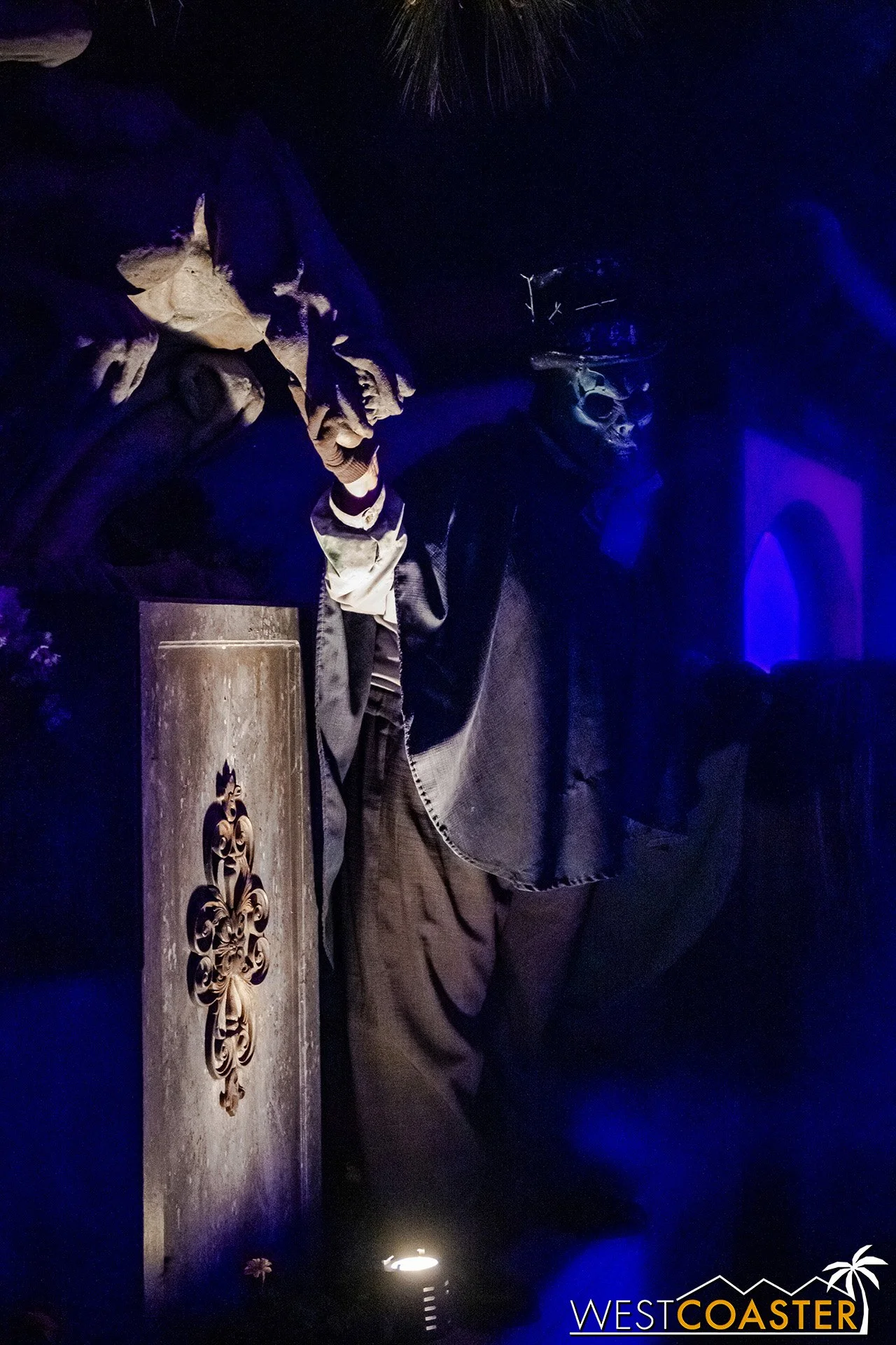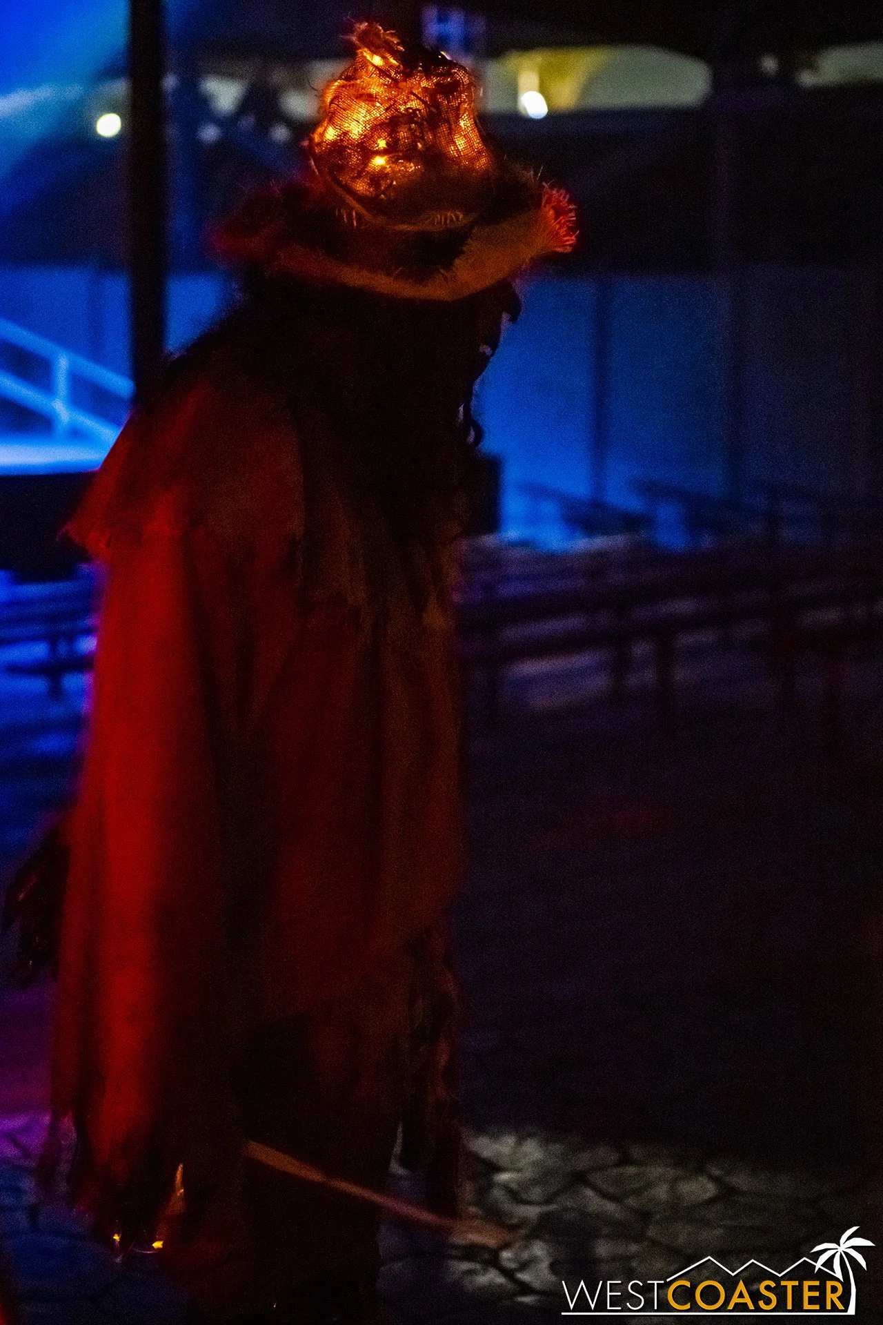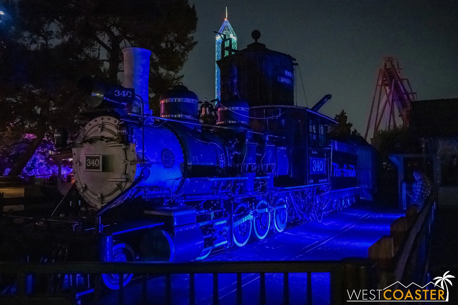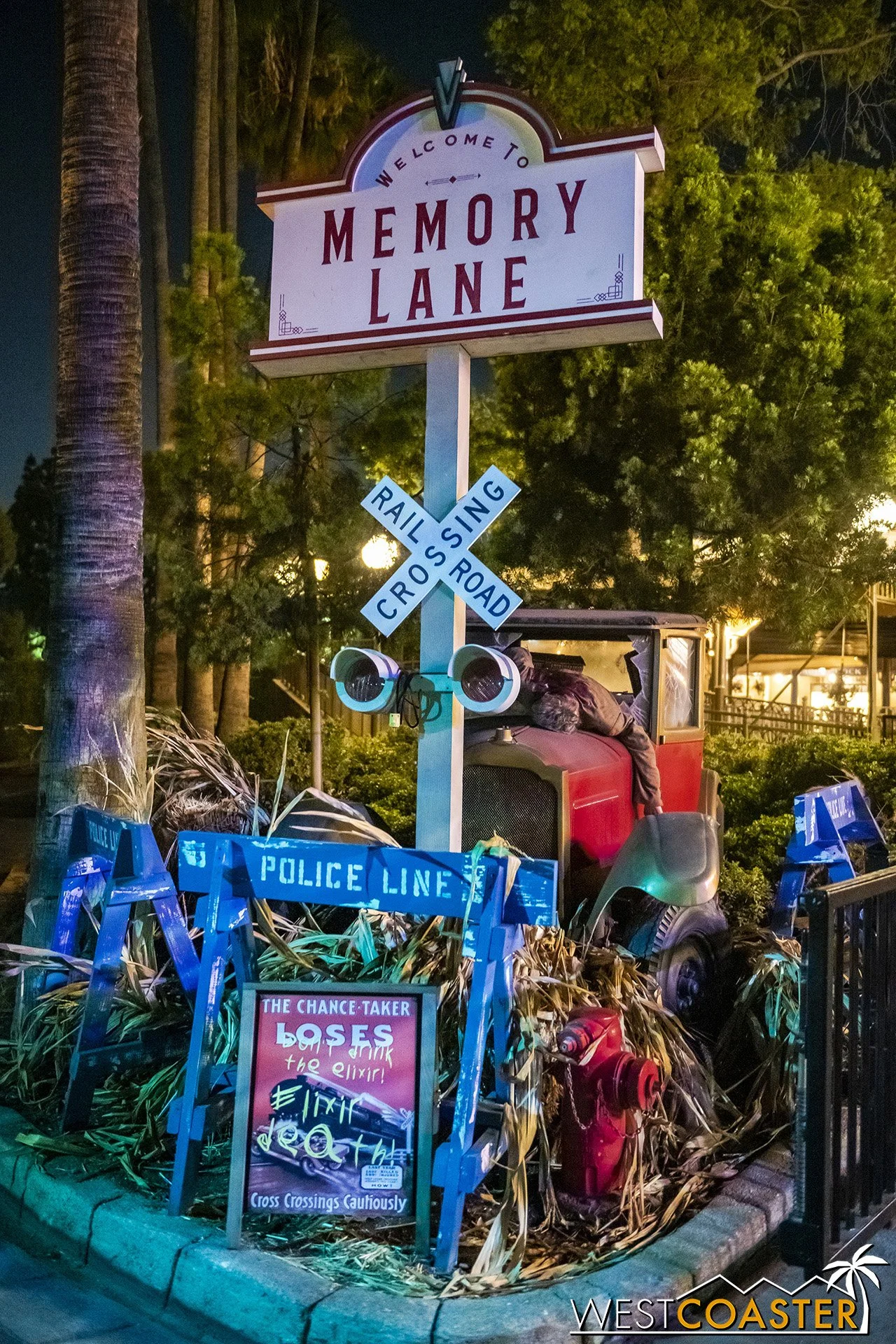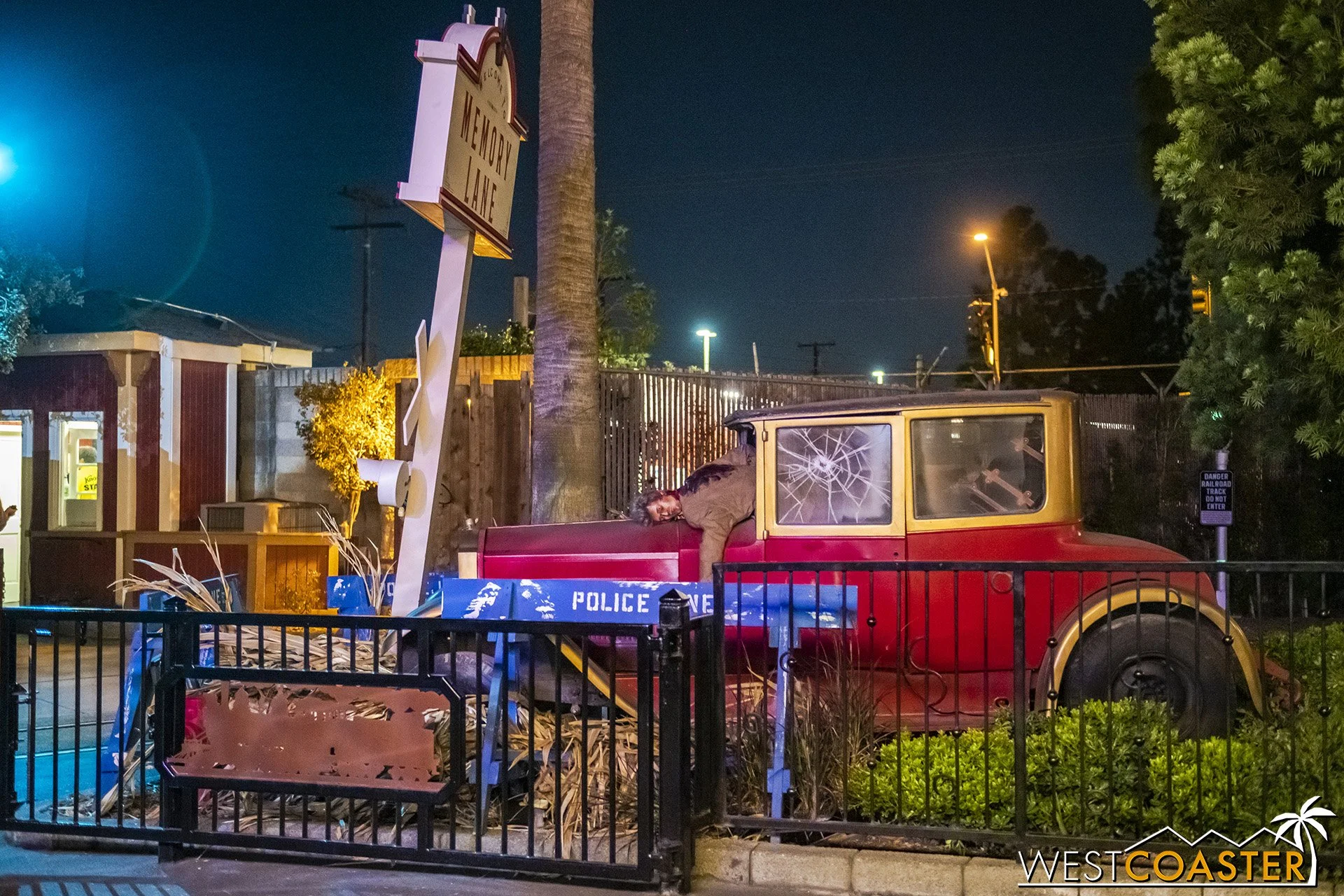 Lastly, we’ll close the update with some photos of the beautiful front gate entry area. Knott’s had been changing this up every year, but the current set-up is pretty iconic and has remained generally the same—dominated by the trio of towering skeletons (long before Home Depot made them commonplace) and a gravely setting. It’s a regular photo op spot throughout the night and after park closing, much like Sleeping Beauty Castle at Disneyland—if only that castle was made of bones!