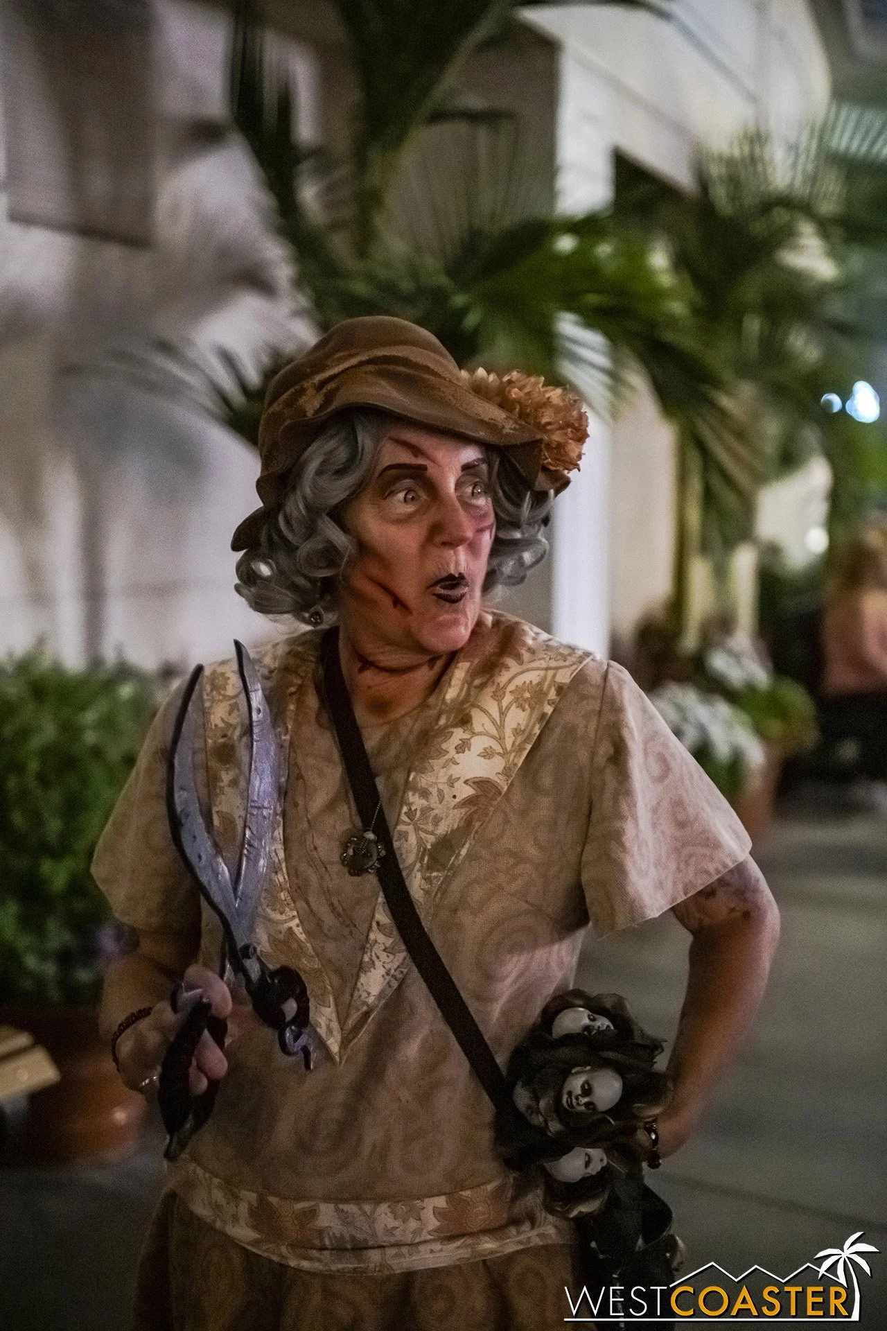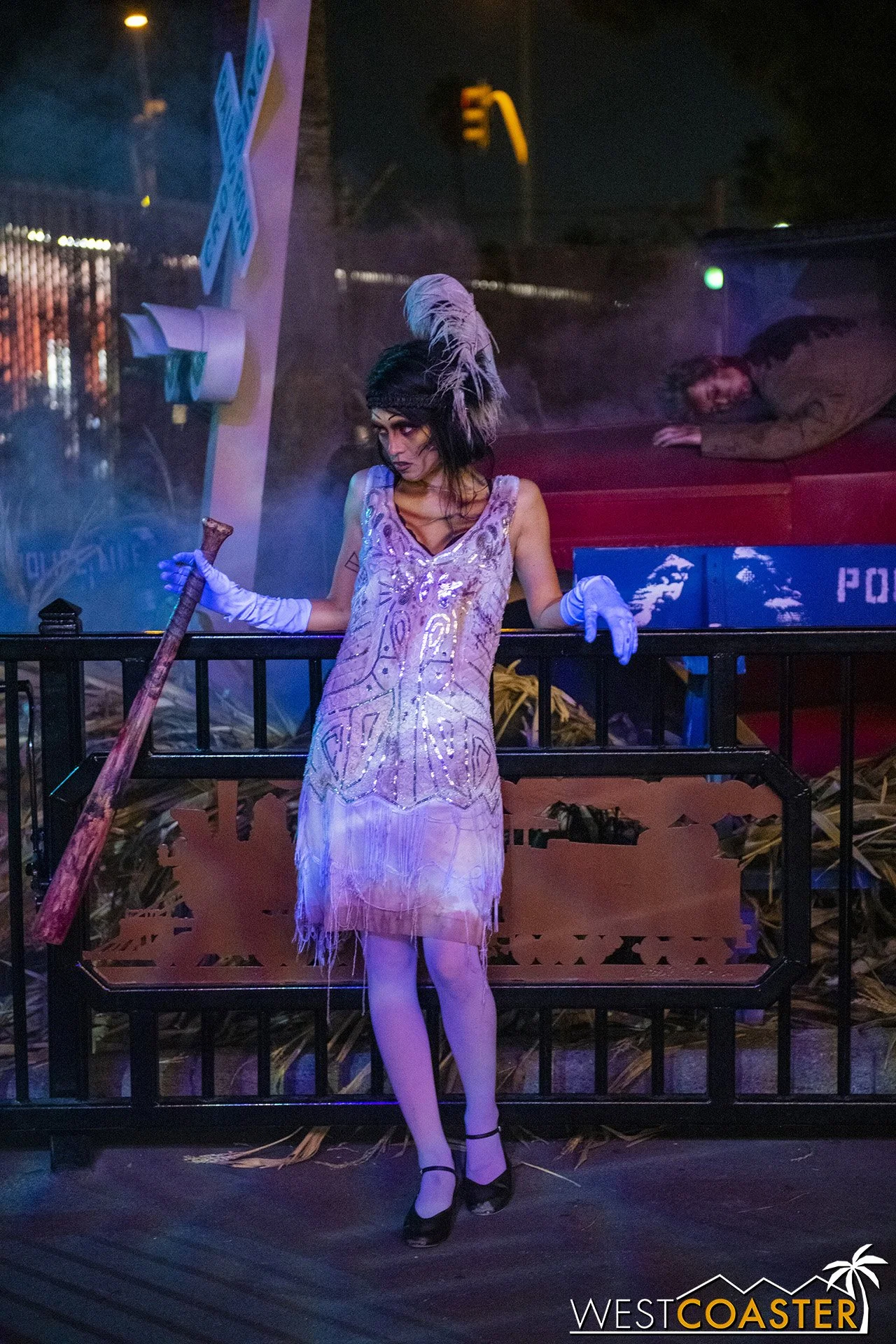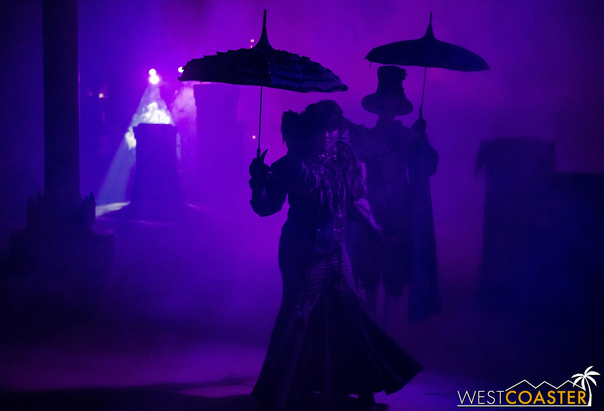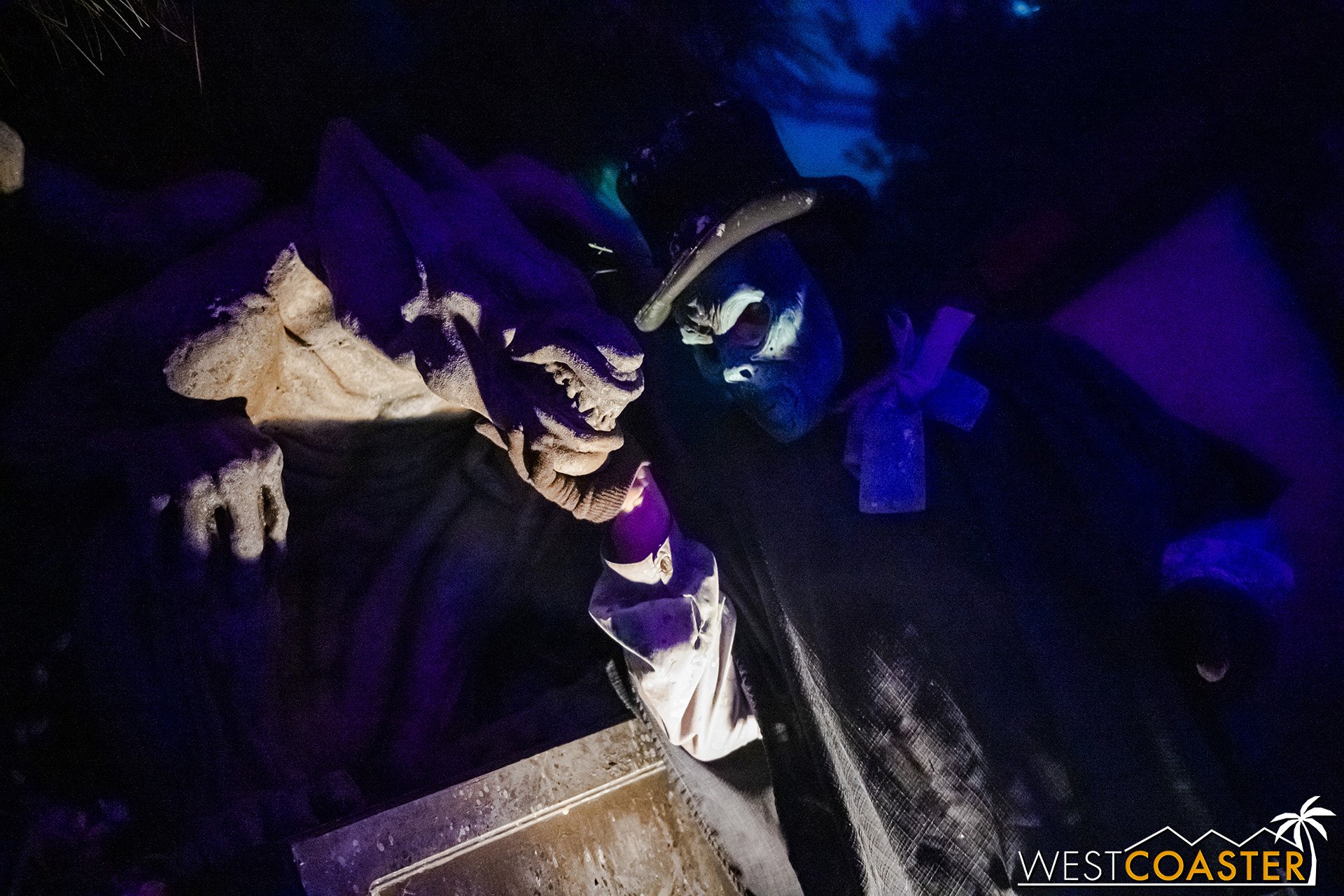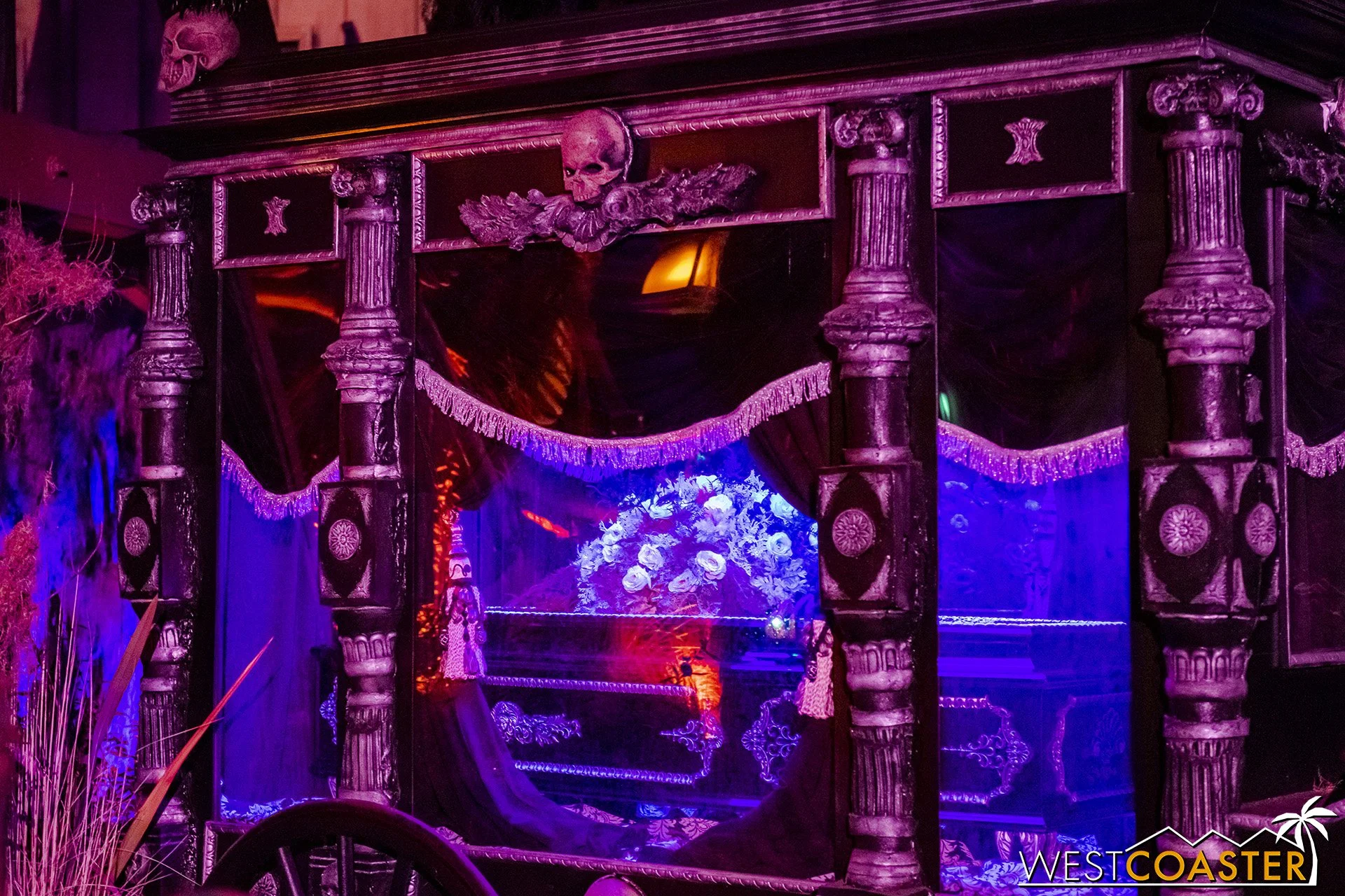 The second newest scare zone, Forsake Lake has grown into its own from a scenic perspective, with sets scattered around the former Reflection Lake and the purple and green lighting creating an eerie, marshy ambiance that is delightfully Gothic and echoes a bayou backdrop. This scare zone seemed less trafficked than usual during our visits, likely because of the ongoing Fiesta Village construction, which was constrained pathways. But the characters still go about their undead ways. Plus, the unscheduled funeral procession mini-show is always chilling to catch, and it takes place twice a night!