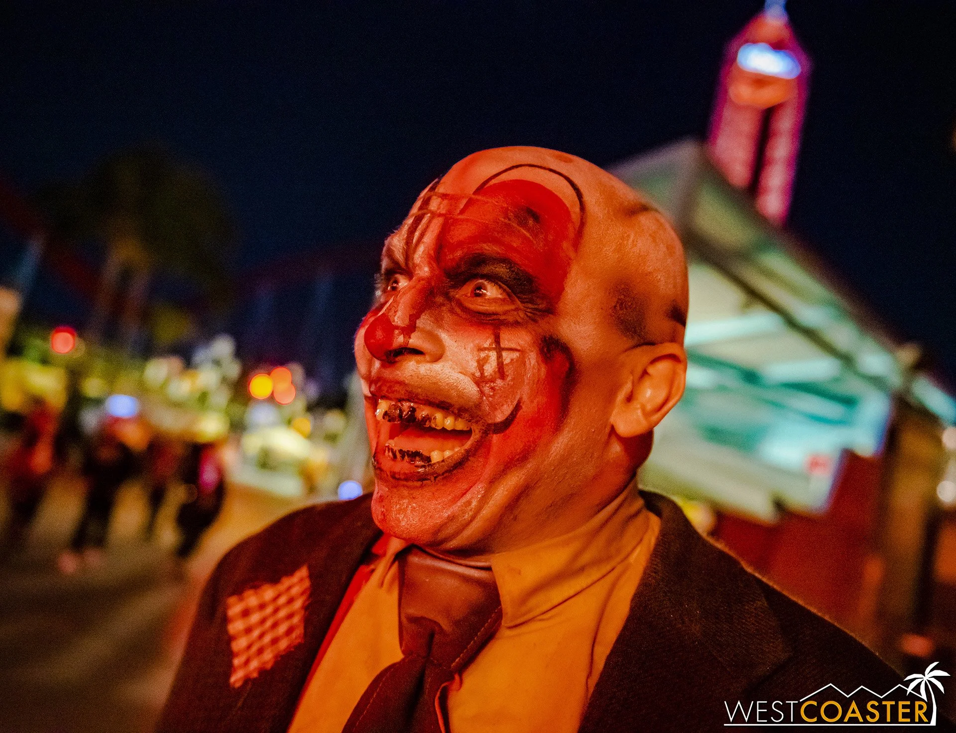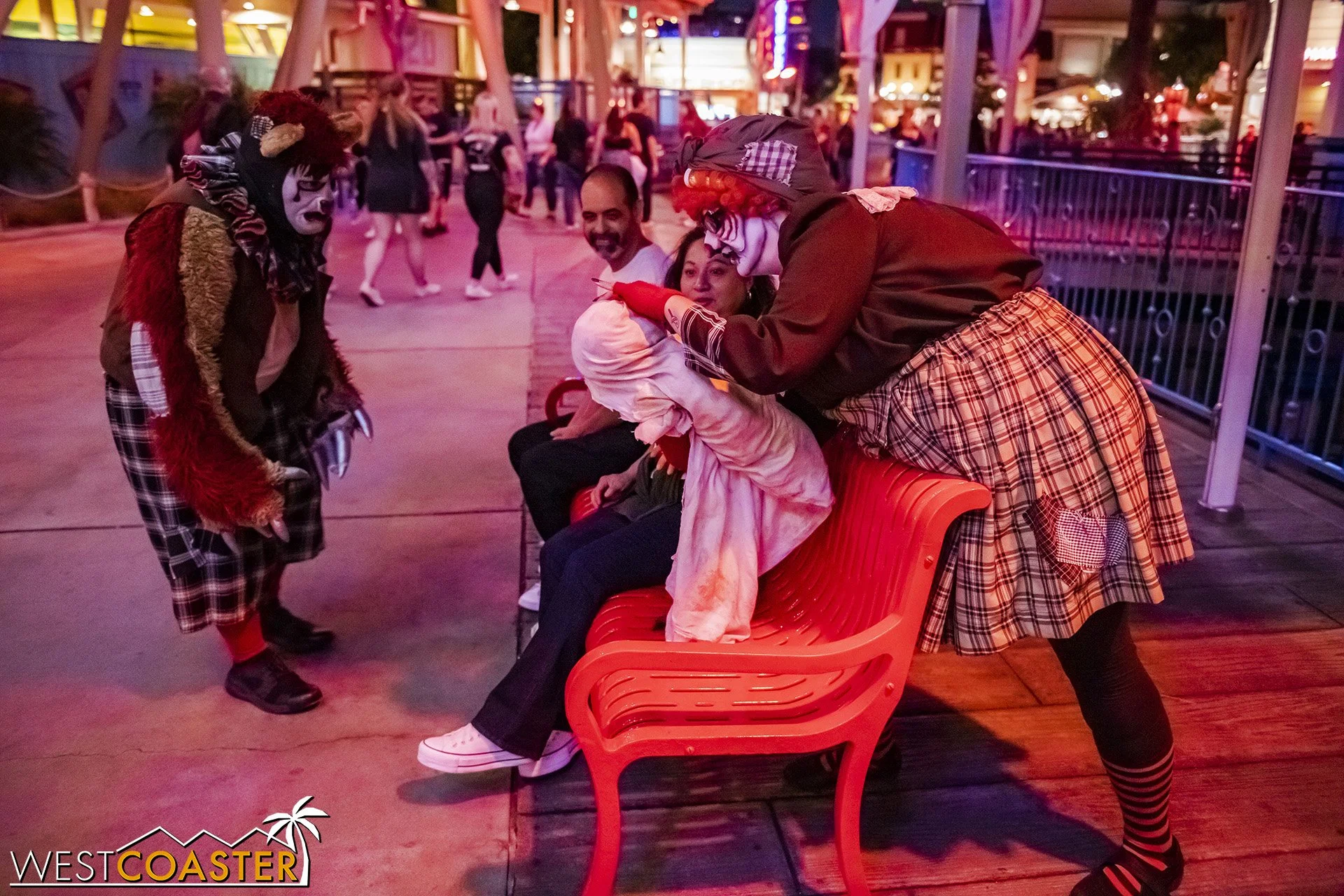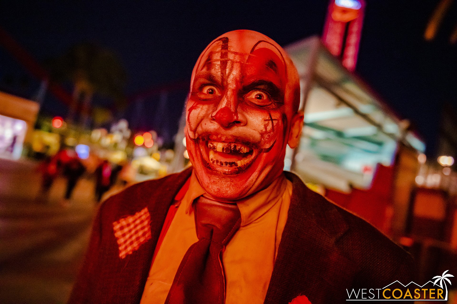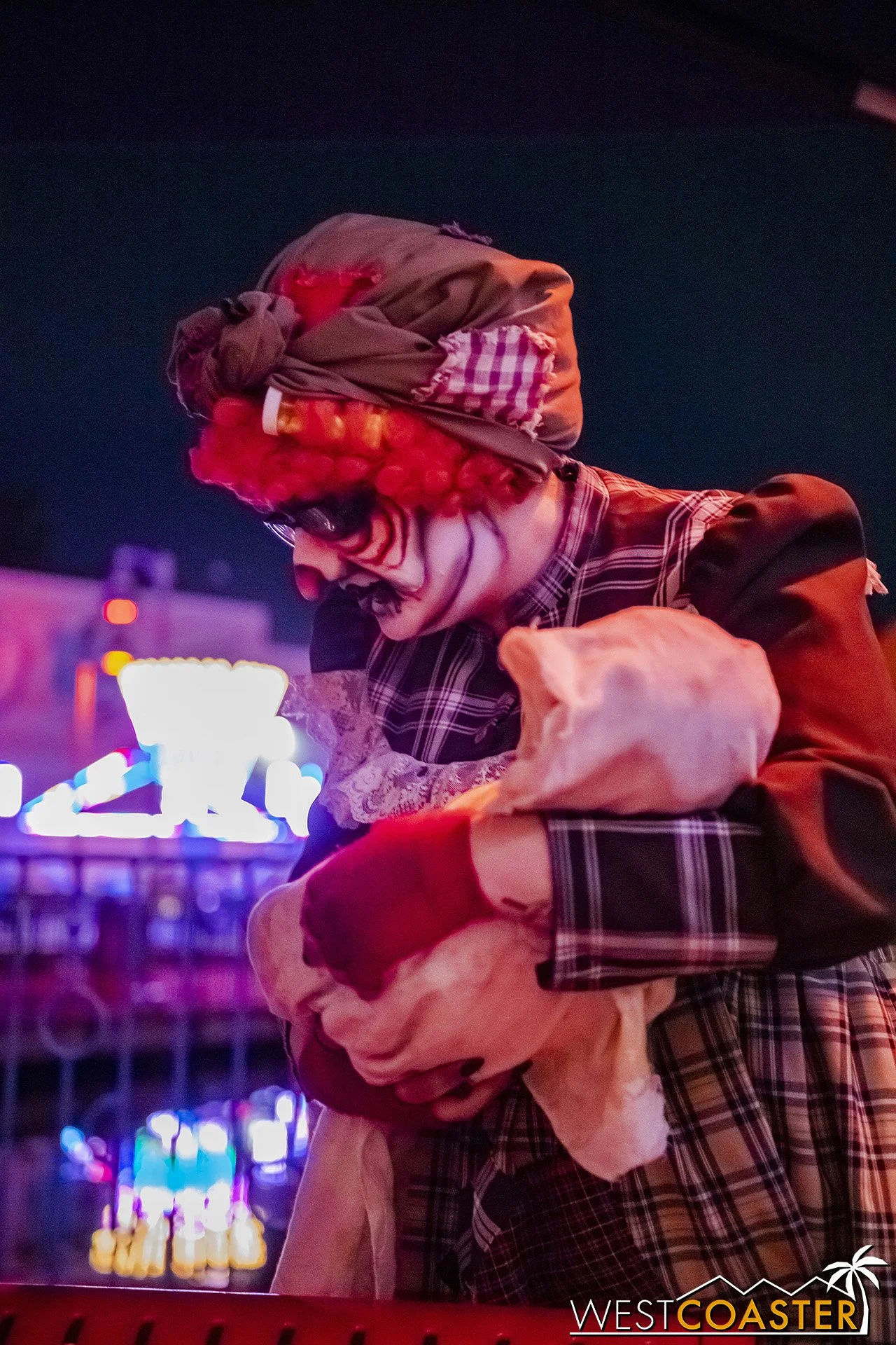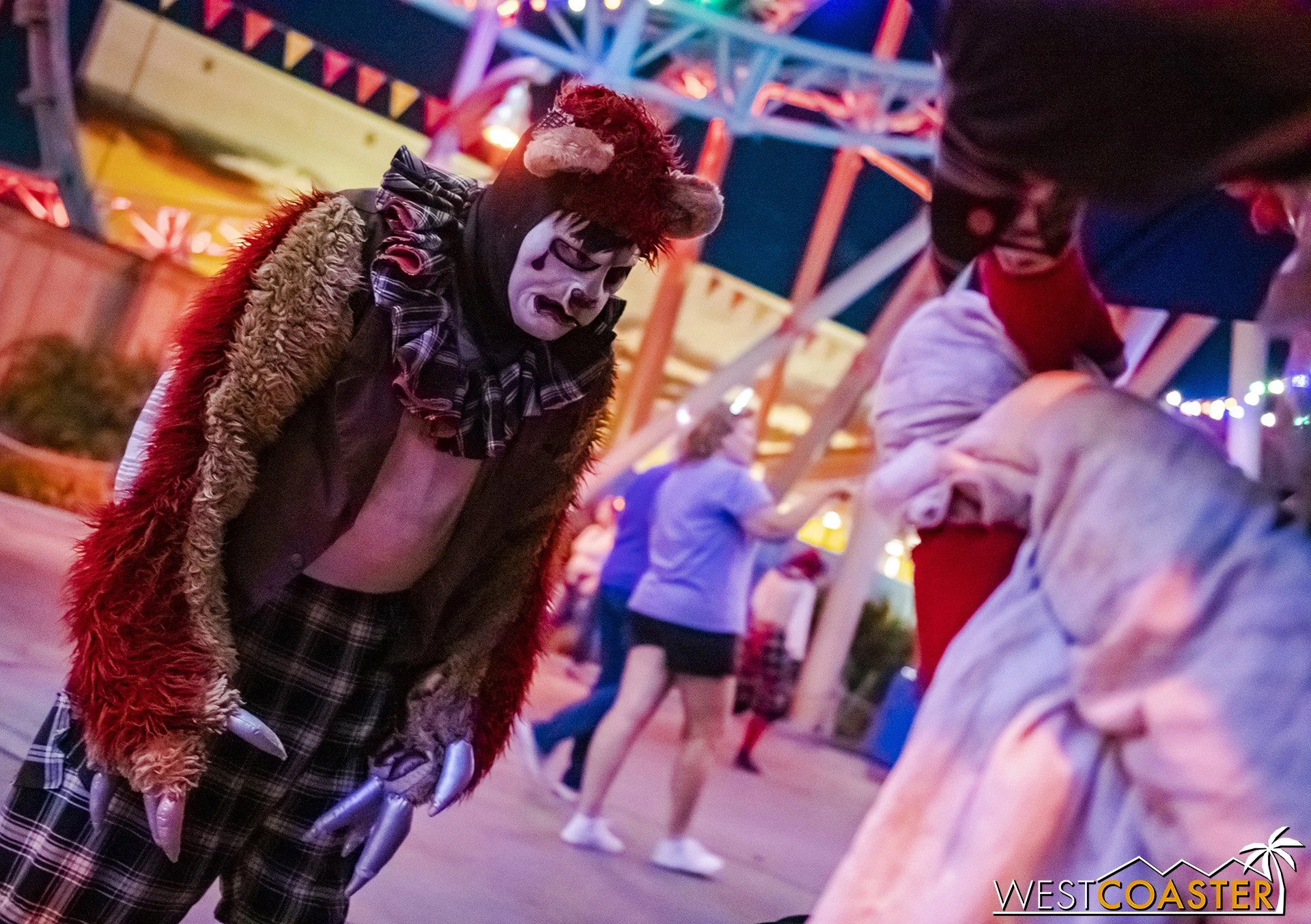 Bright, fogless, and open, Carnevil is the absolute antithesis of Ghost Town. With limited advantages for hiding spots, the scareactors here must rely on coulrophobia to achieve their scares. But barring that, they’re also the most hilarious scareactors in the park, because they get to live up to their stereotype was pranksters and maniacs and entertainers. Whether it’s with improvised skits using their own scare props, stalking or mocking guests, or role playing some absurd game with each other as a distraction for team-up scares, the clowns in Carnevil put on quite a show. We do wish that Knott’s would incorporate more set pieces—even if they were mobile—to give the area more ambiance than just colorful lights and freak show banners, but the fantastic talent still find a way to get their frights and startles.