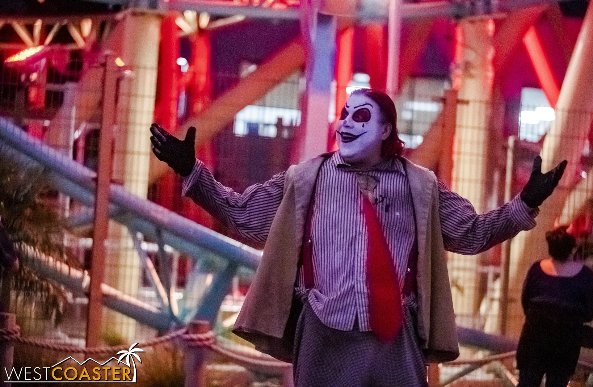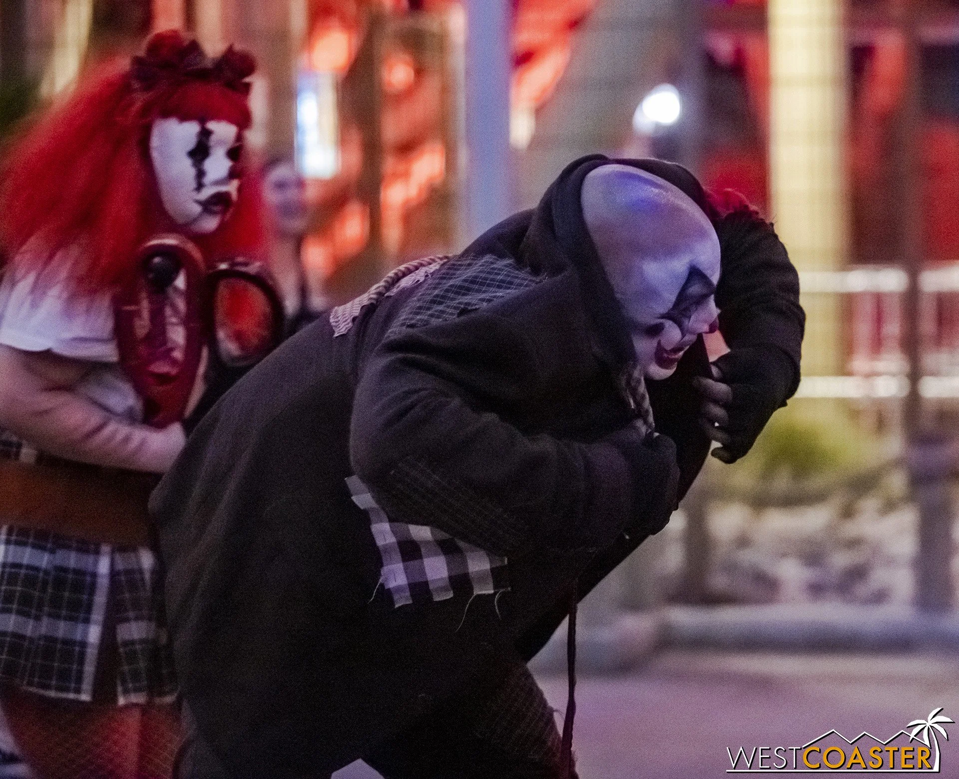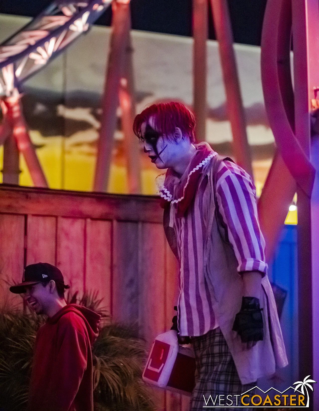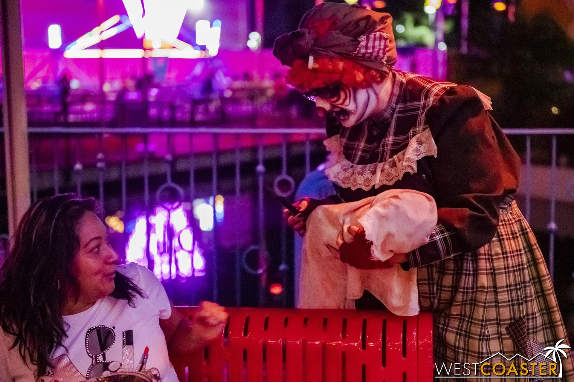 Bright, fogless, and open, Carnevil is the absolute antithesis of Ghost Town. With limited advantages for hiding spots, the scareactors here must rely on coulrophobia to achieve their scares. But barring that, they’re also the most hilarious scareactors in the park, because they get to live up to their stereotype was pranksters and maniacs and entertainers. Whether it’s with improvised skits using their own scare props, stalking or mocking guests, or role playing some absurd game with each other as a distraction for team-up scares, the clowns in Carnevil put on quite a show. We do wish that Knott’s would incorporate more set pieces—even if they were mobile—to give the area more ambiance than just colorful lights and freak show banners, but the fantastic talent still find a way to get their frights and startles.