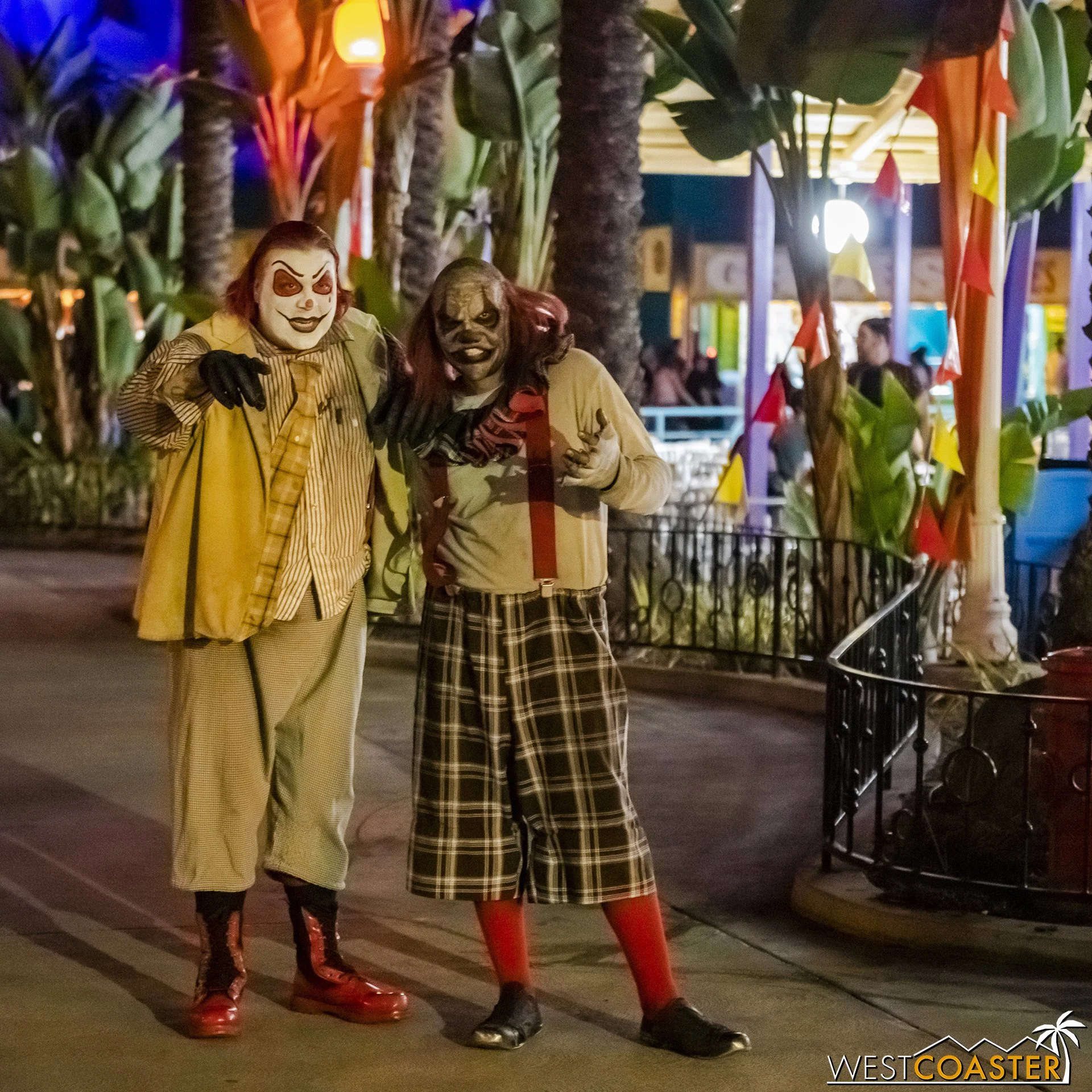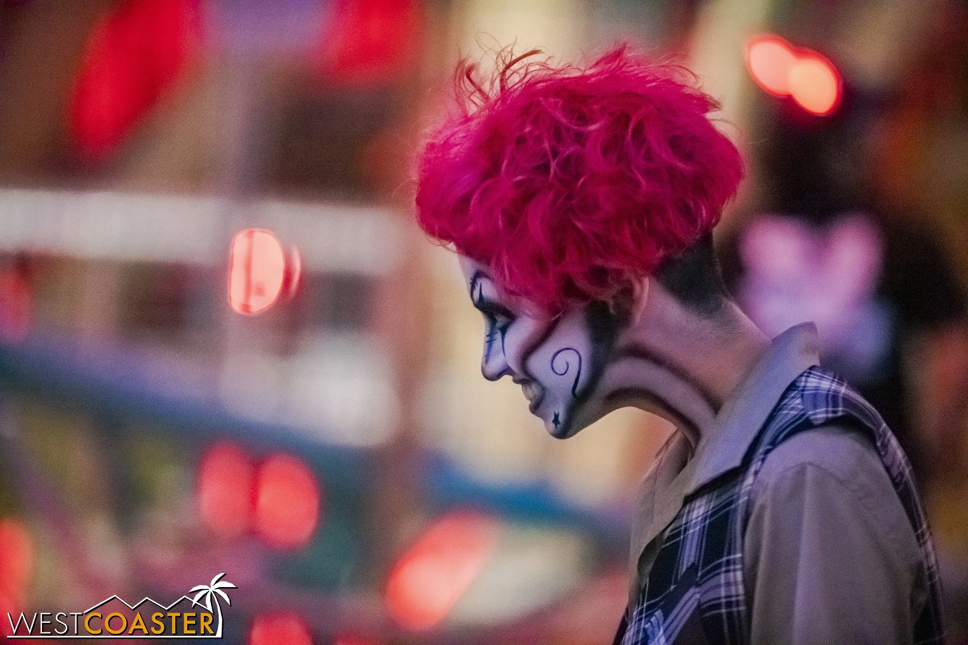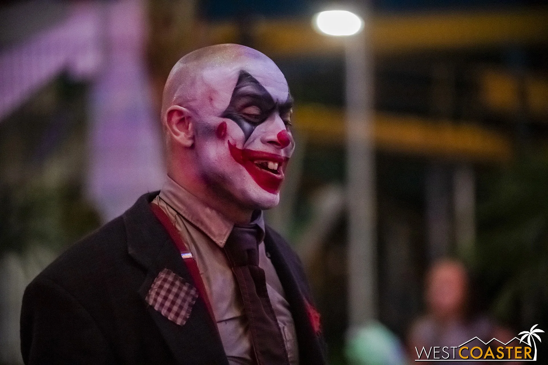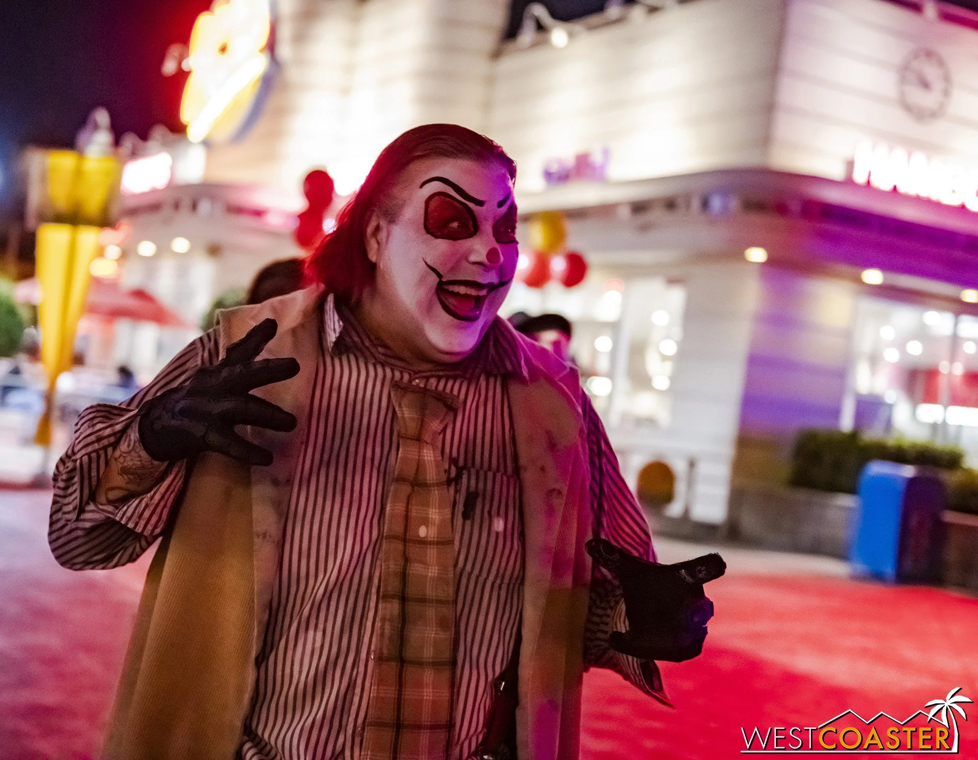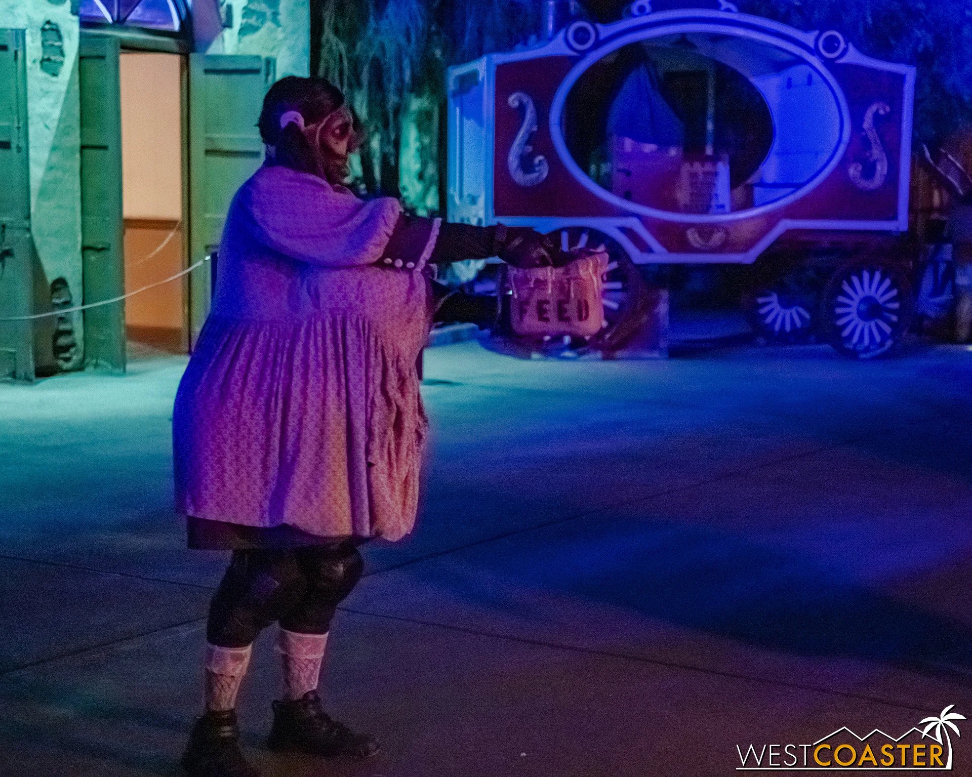 Bright, fogless, and open, Carnevil is the absolute antithesis of Ghost Town. With limited advantages for hiding spots, the scareactors here must rely on coulrophobia to achieve their scares. But barring that, they’re also the most hilarious scareactors in the park, because they get to live up to their stereotype was pranksters and maniacs and entertainers. Whether it’s with improvised skits using their own scare props, stalking or mocking guests, or role playing some absurd game with each other as a distraction for team-up scares, the clowns in Carnevil put on quite a show. We do wish that Knott’s would incorporate more set pieces—even if they were mobile—to give the area more ambiance than just colorful lights and freak show banners, but the fantastic talent still find a way to get their frights and startles.