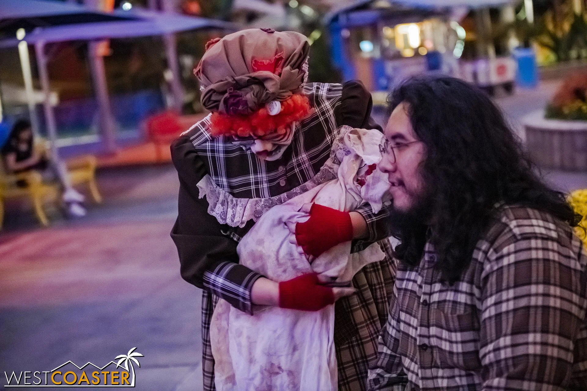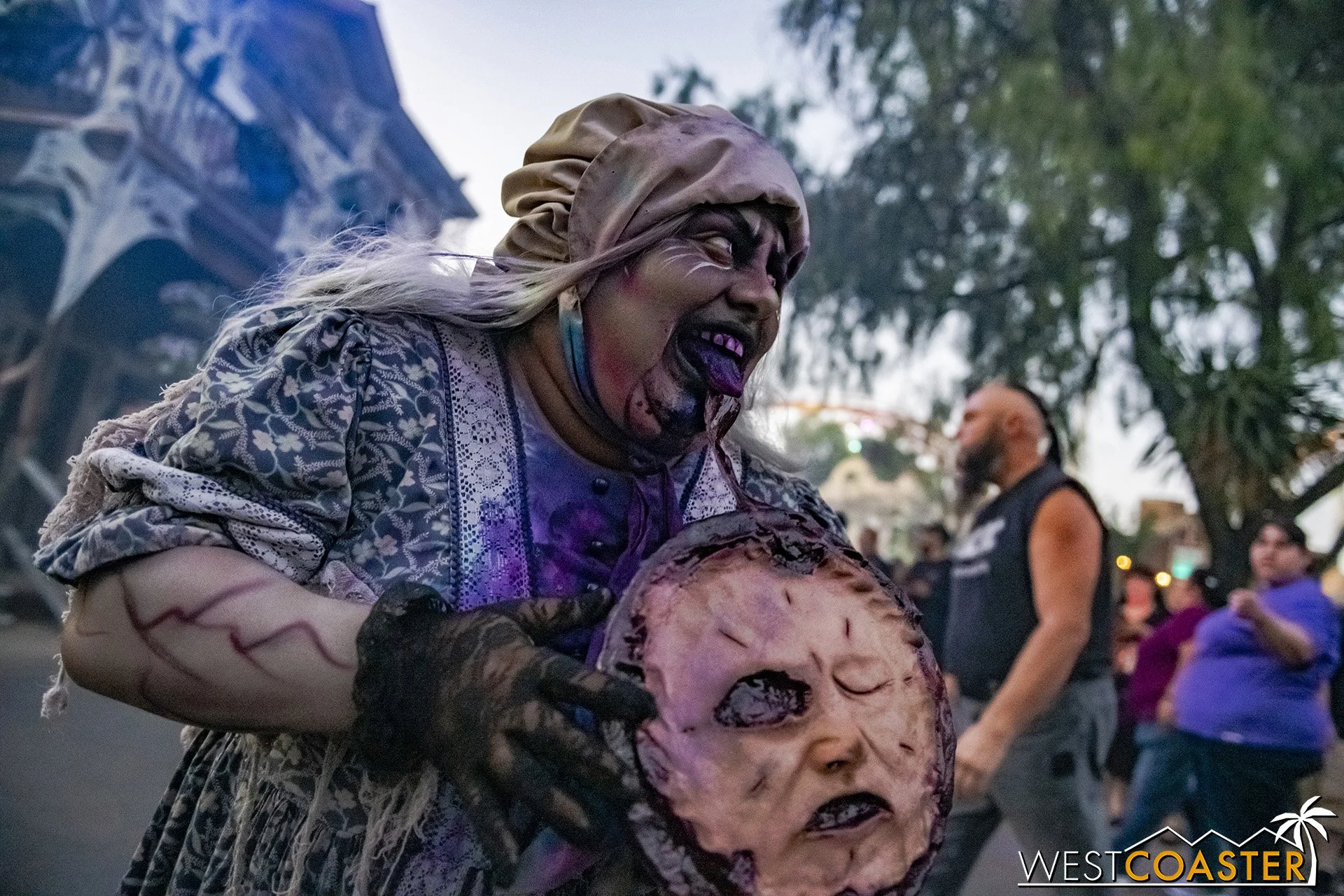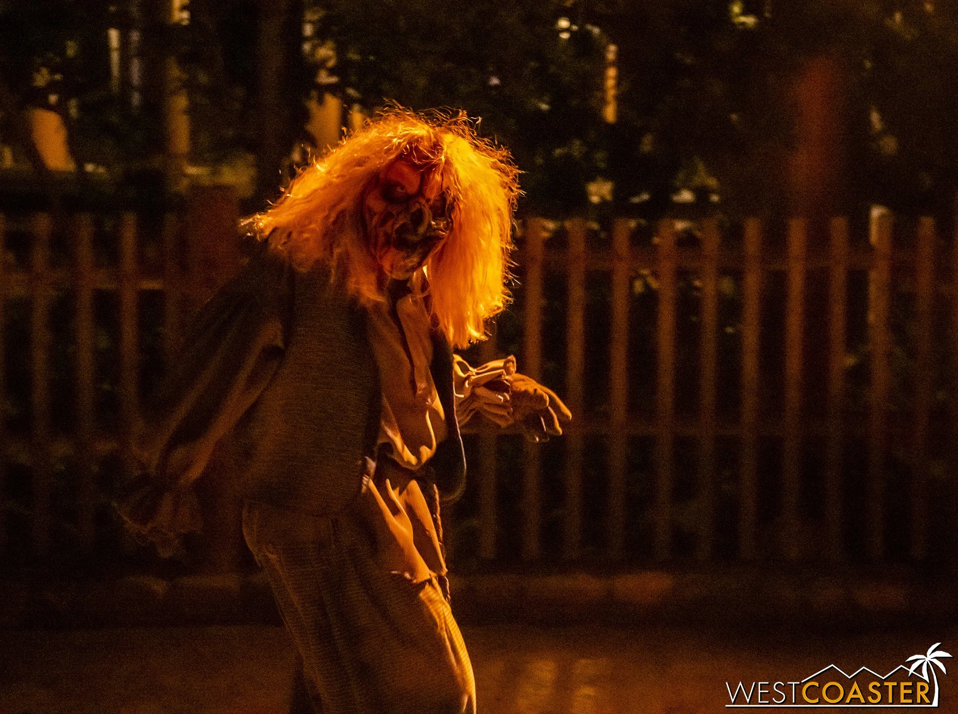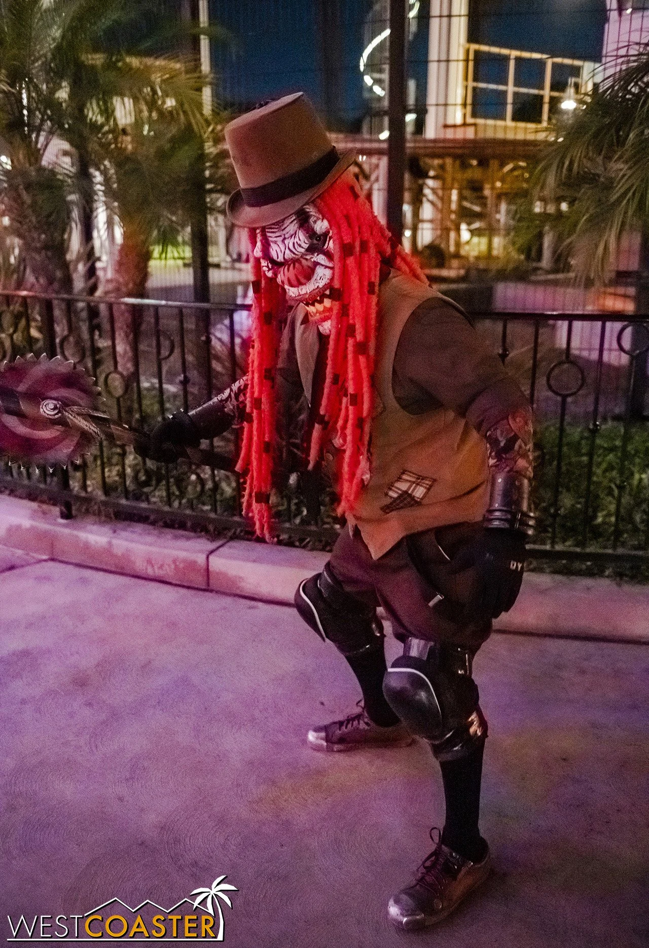Bright, fogless, and open, Carnevil is the absolute antithesis of Ghost Town. With limited advantages for hiding spots, the scareactors here must rely on coulrophobia to achieve their scares. But barring that, they’re also the most hilarious scareactors in the park, because they get to live up to their stereotype was pranksters and maniacs and entertainers. Whether it’s with improvised skits using their own scare props, stalking or mocking guests, or role playing some absurd game with each other as a distraction for team-up scares, the clowns in Carnevil put on quite a show. We do wish that Knott’s would incorporate more set pieces—even if they were mobile—to give the area more ambiance than just colorful lights and freak show banners, but the fantastic talent still find a way to get their frights and startles.