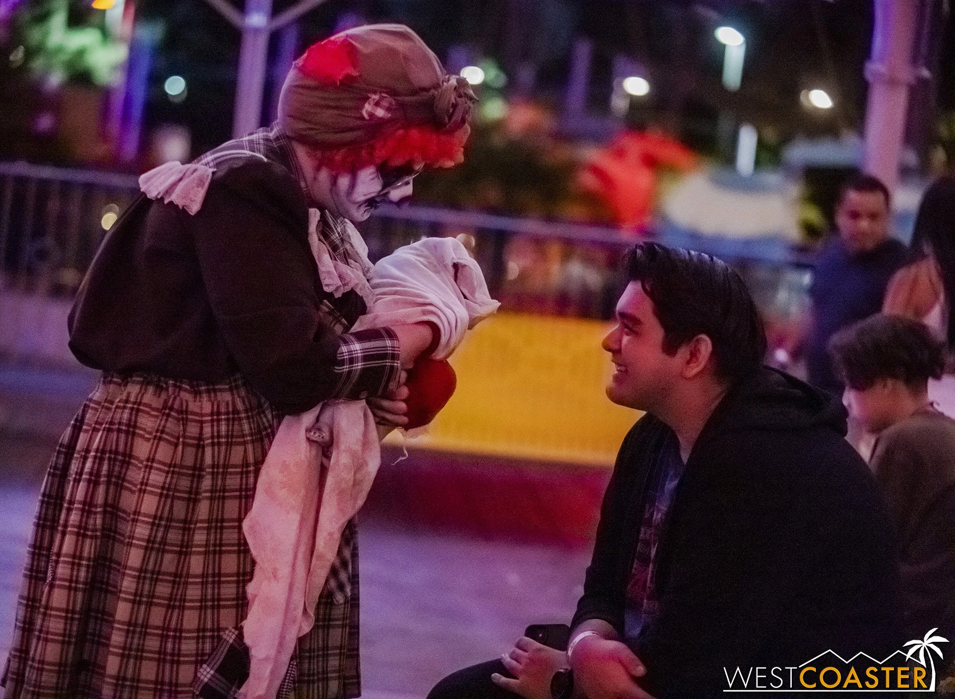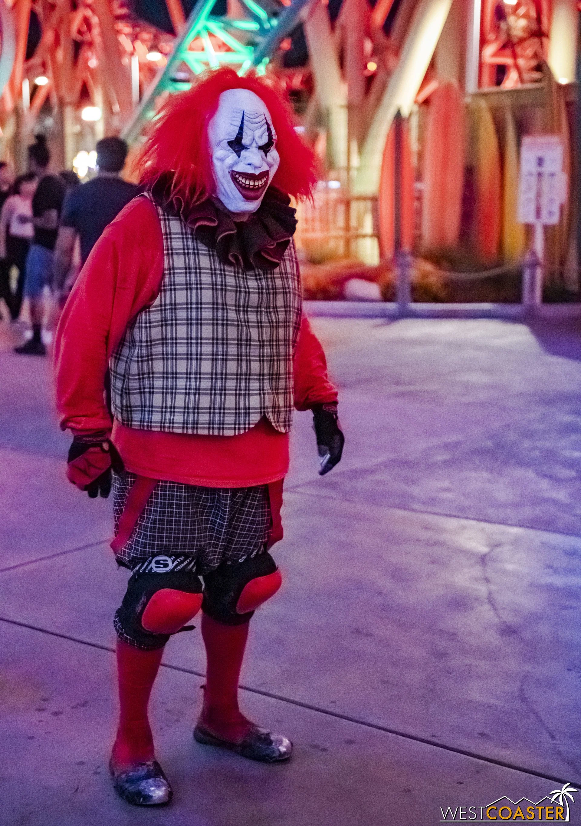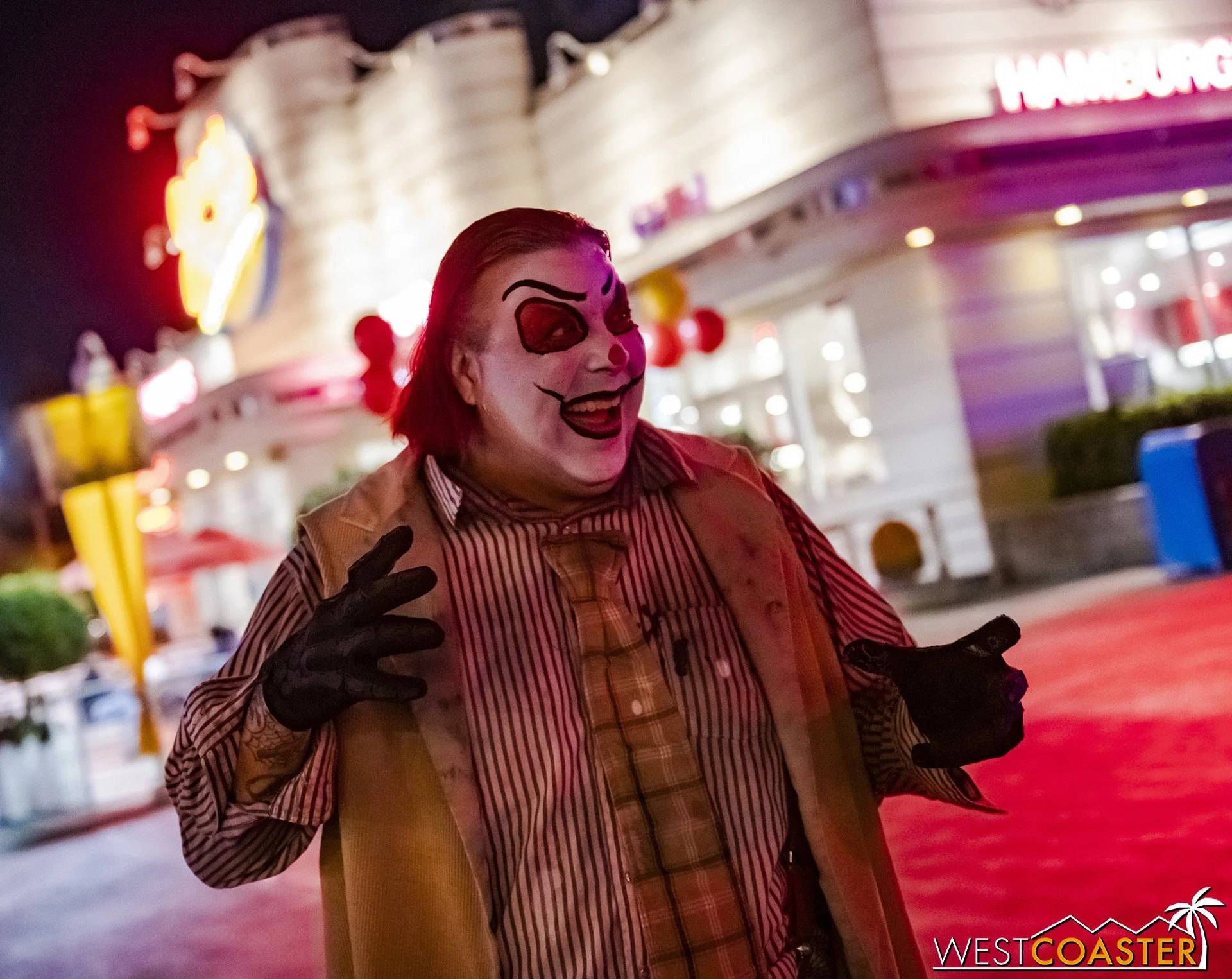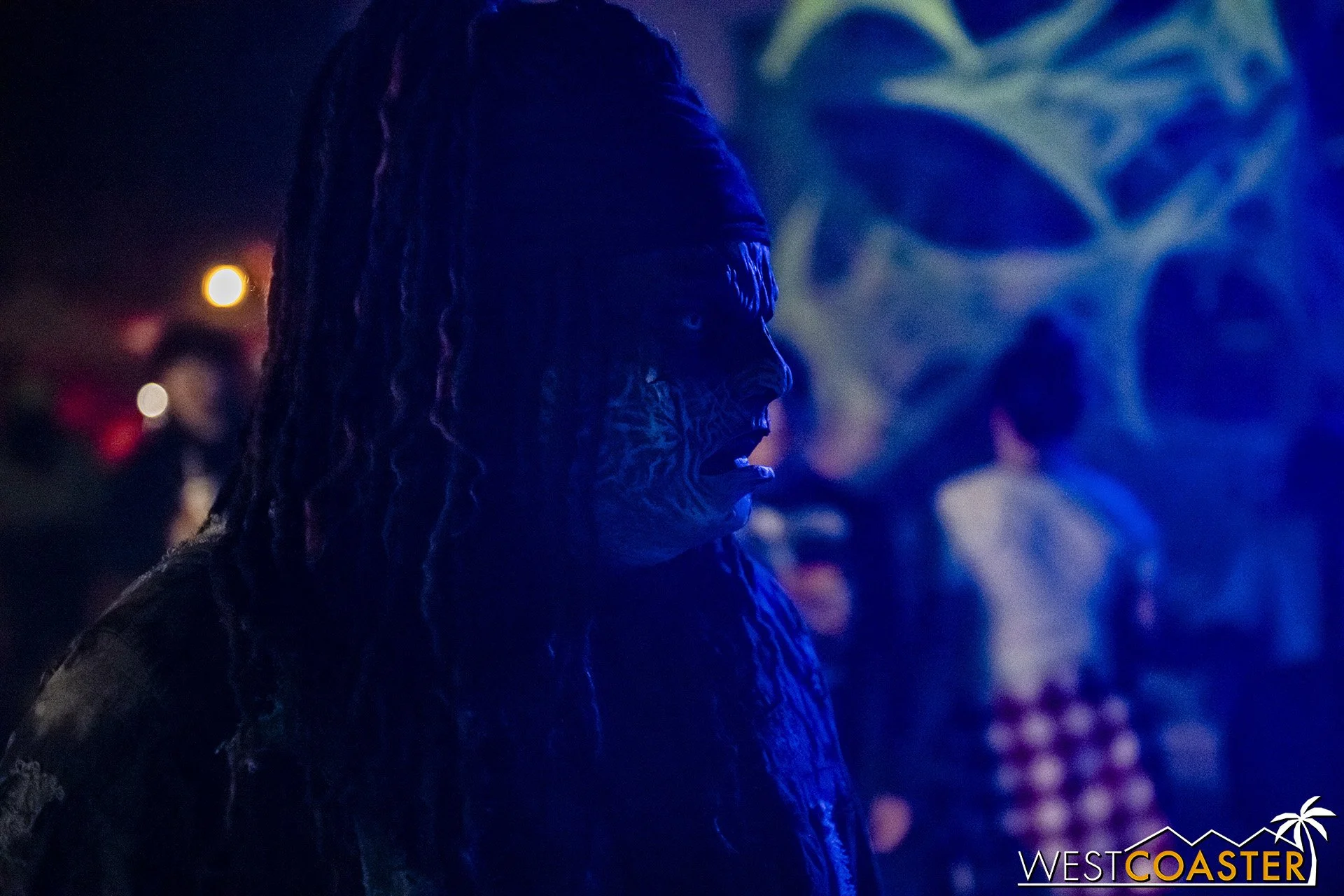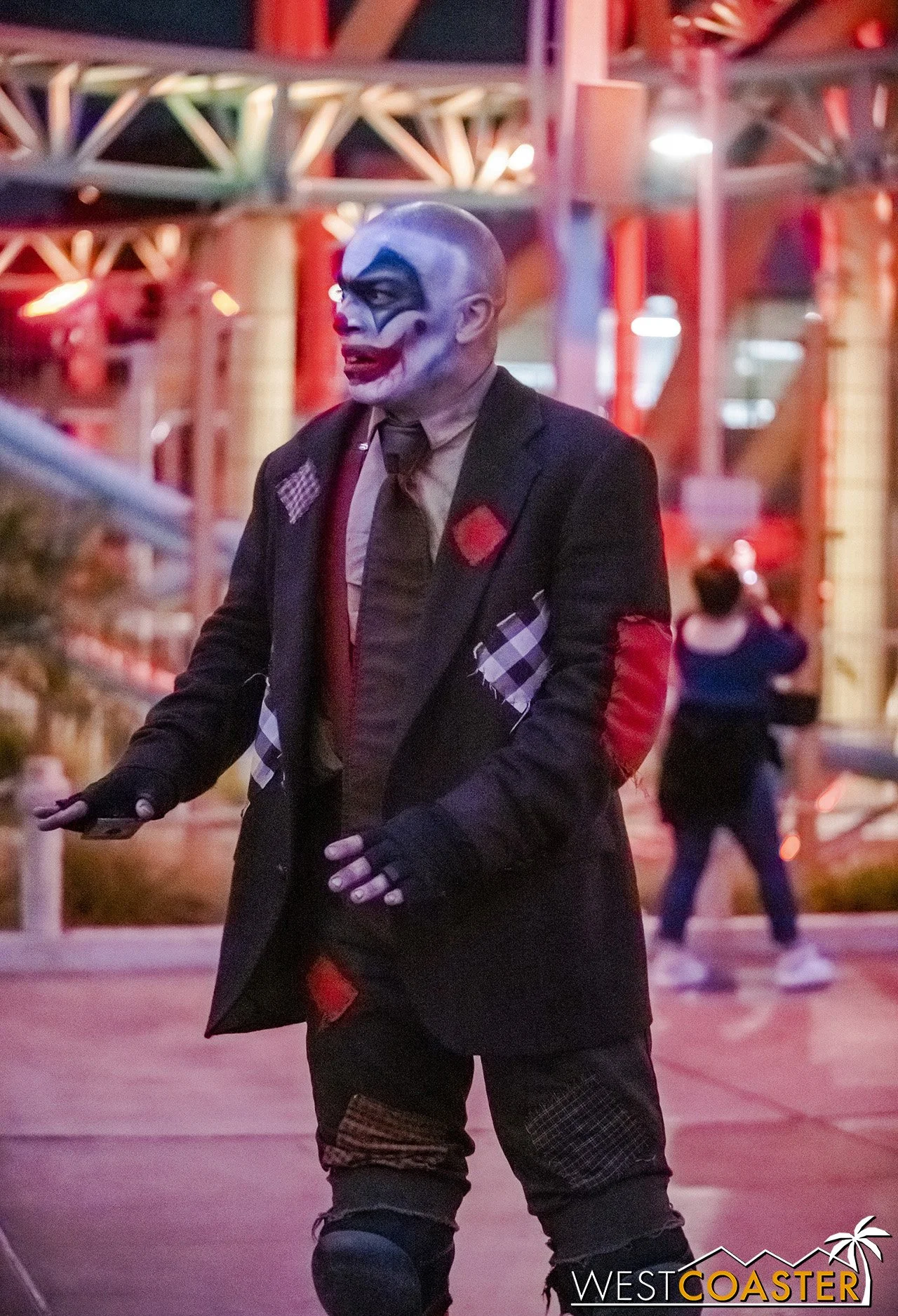 Bright, fogless, and open, Carnevil is the absolute antithesis of Ghost Town. With limited advantages for hiding spots, the scareactors here must rely on coulrophobia to achieve their scares. But barring that, they’re also the most hilarious scareactors in the park, because they get to live up to their stereotype was pranksters and maniacs and entertainers. Whether it’s with improvised skits using their own scare props, stalking or mocking guests, or role playing some absurd game with each other as a distraction for team-up scares, the clowns in Carnevil put on quite a show. We do wish that Knott’s would incorporate more set pieces—even if they were mobile—to give the area more ambiance than just colorful lights and freak show banners, but the fantastic talent still find a way to get their frights and startles.