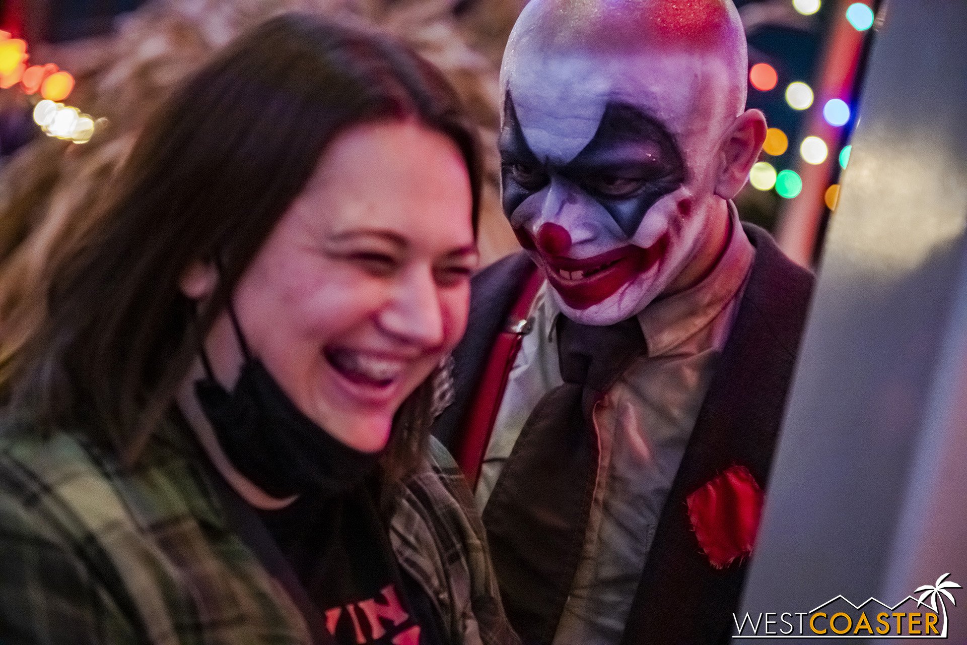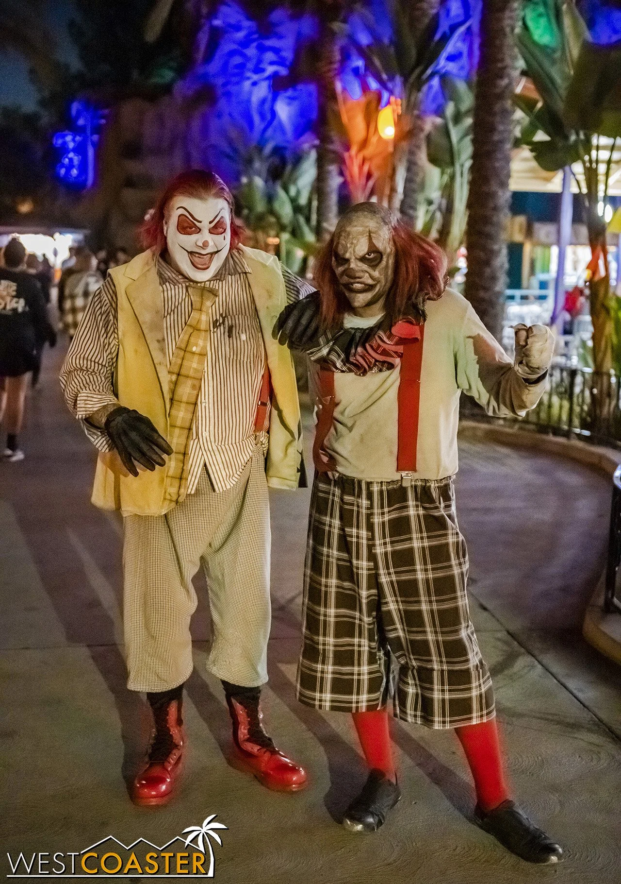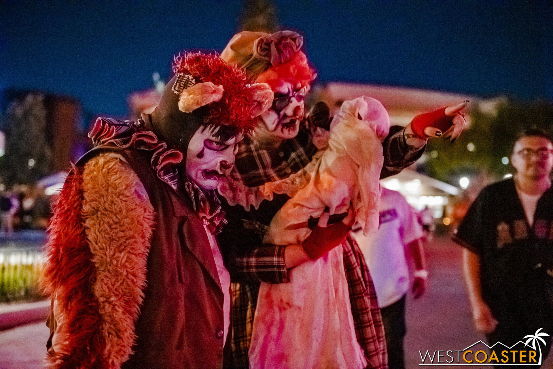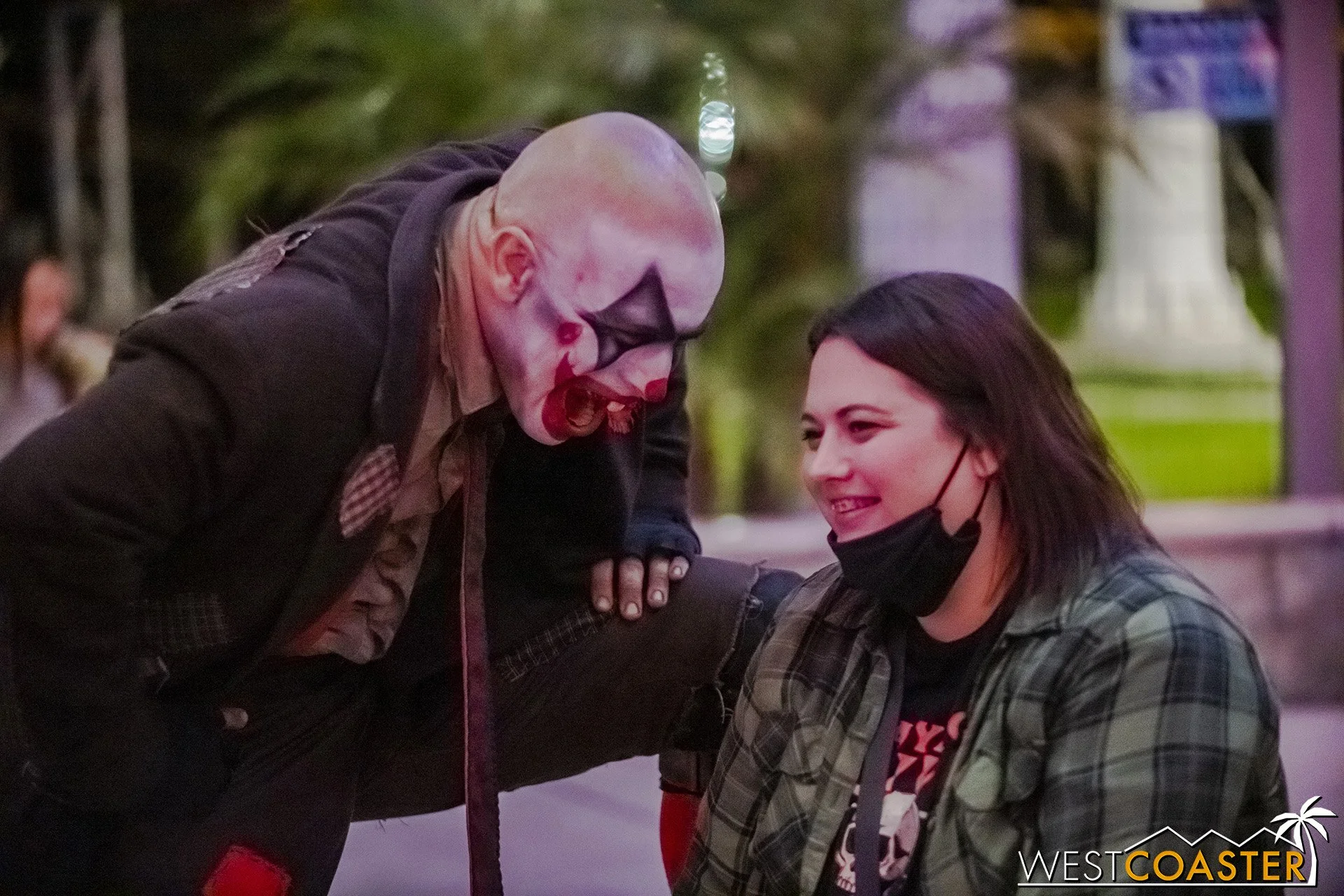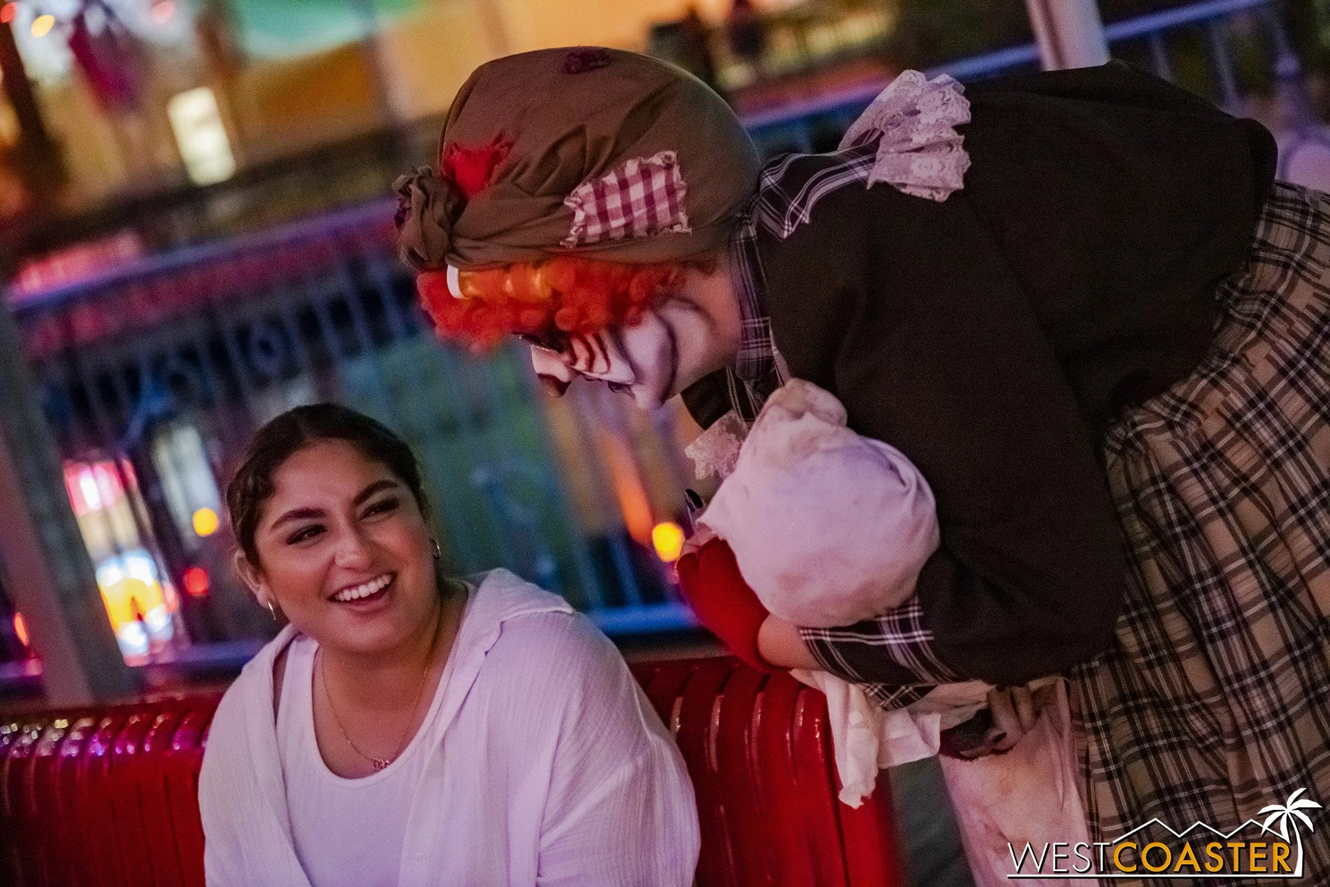 Bright, fogless, and open, Carnevil is the absolute antithesis of Ghost Town. With limited advantages for hiding spots, the scareactors here must rely on coulrophobia to achieve their scares. But barring that, they’re also the most hilarious scareactors in the park, because they get to live up to their stereotype was pranksters and maniacs and entertainers. Whether it’s with improvised skits using their own scare props, stalking or mocking guests, or role playing some absurd game with each other as a distraction for team-up scares, the clowns in Carnevil put on quite a show. We do wish that Knott’s would incorporate more set pieces—even if they were mobile—to give the area more ambiance than just colorful lights and freak show banners, but the fantastic talent still find a way to get their frights and startles.