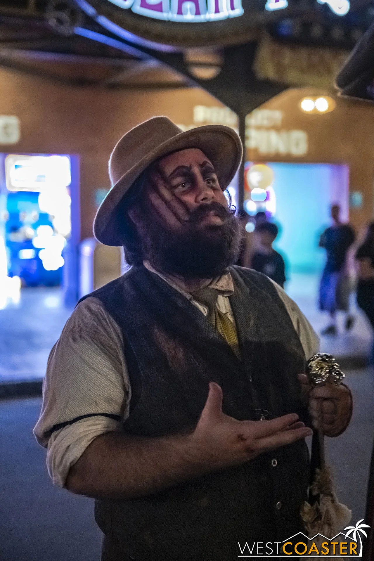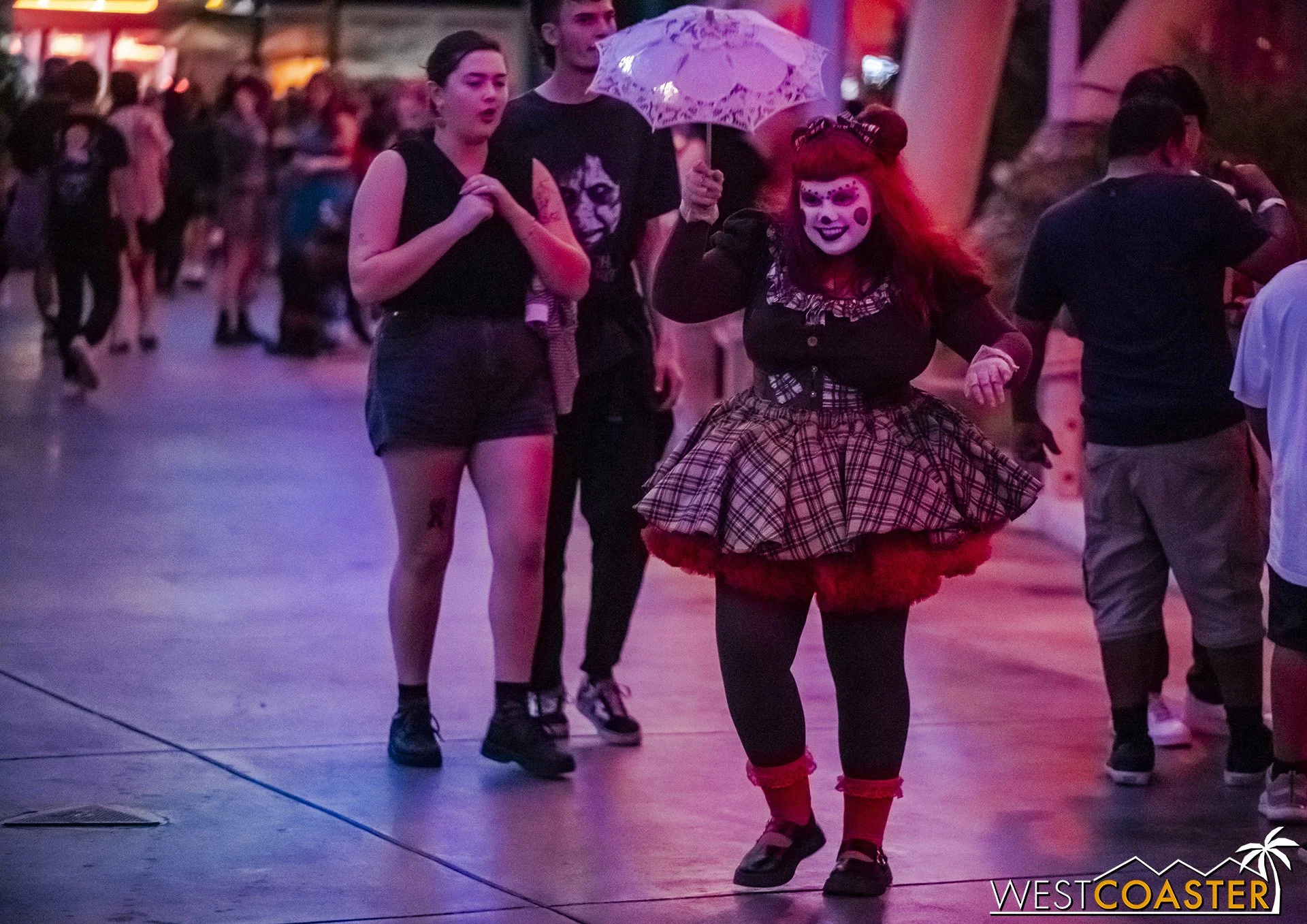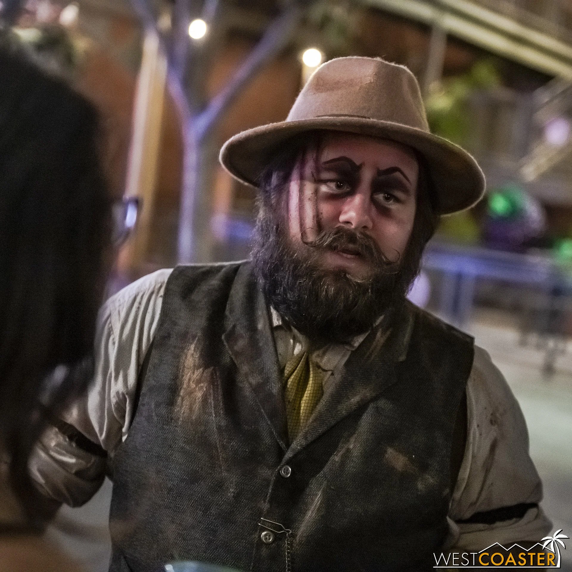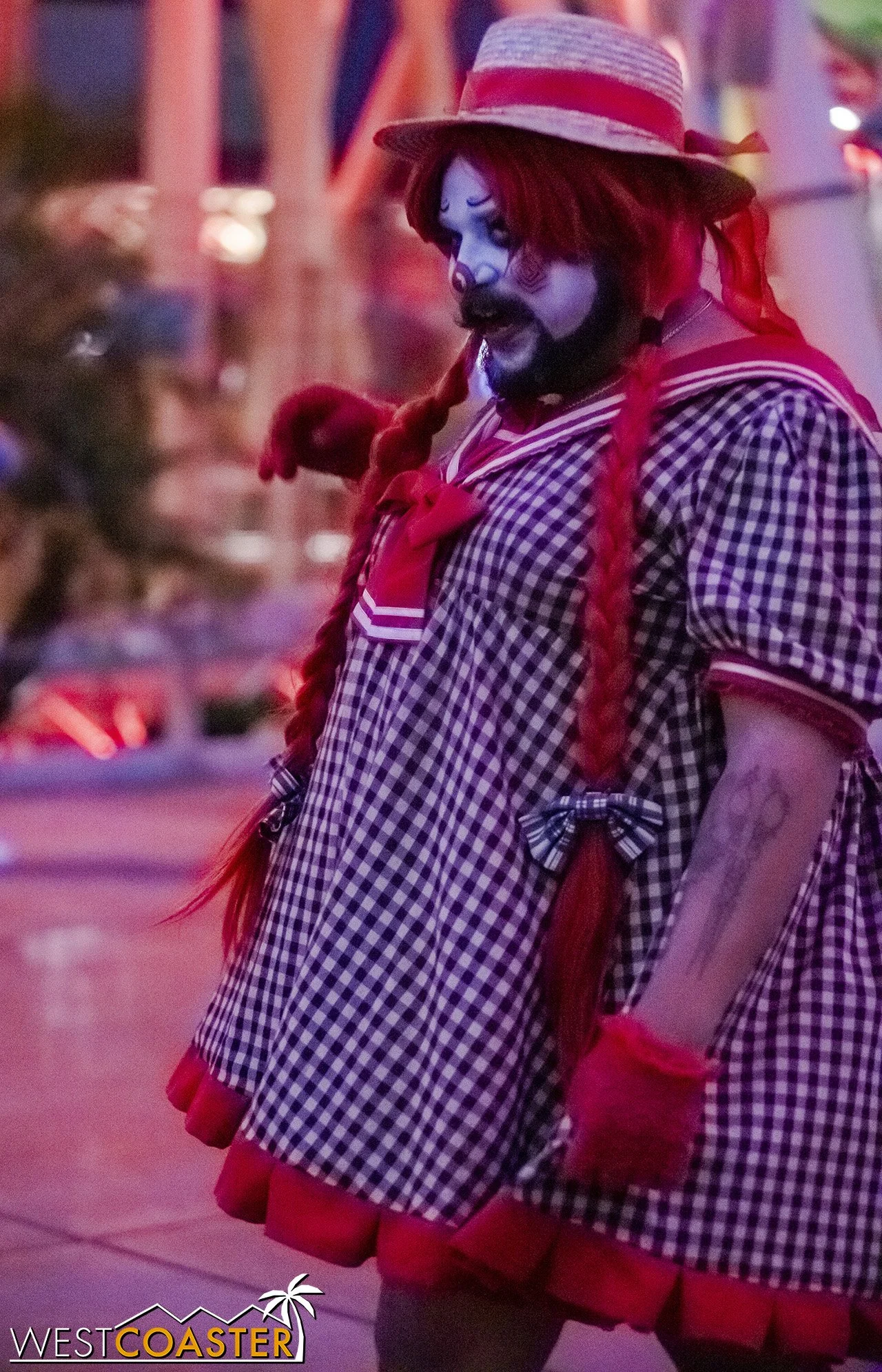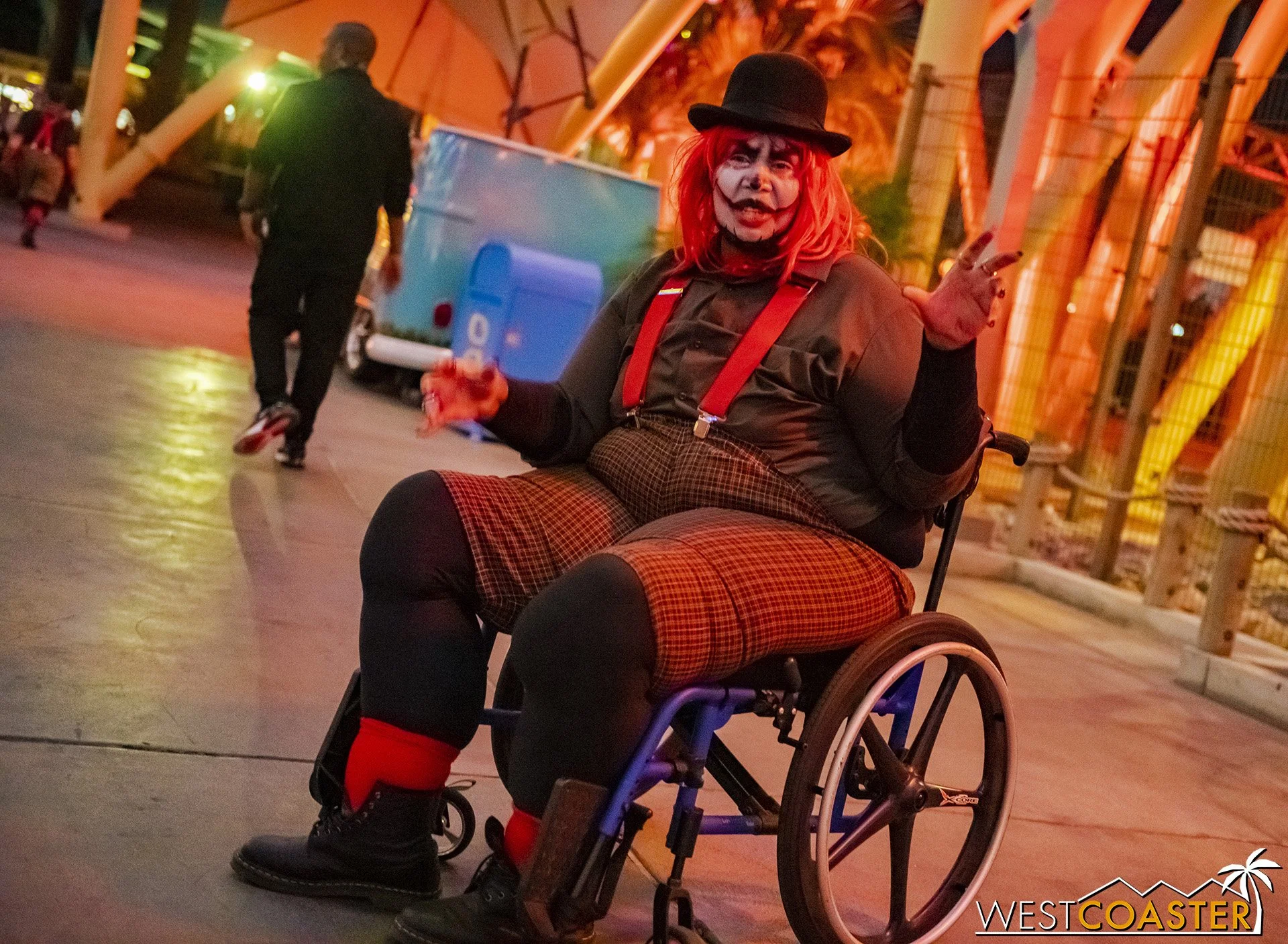 Bright, fogless, and open, Carnevil is the absolute antithesis of Ghost Town. With limited advantages for hiding spots, the scareactors here must rely on coulrophobia to achieve their scares. But barring that, they’re also the most hilarious scareactors in the park, because they get to live up to their stereotype was pranksters and maniacs and entertainers. Whether it’s with improvised skits using their own scare props, stalking or mocking guests, or role playing some absurd game with each other as a distraction for team-up scares, the clowns in Carnevil put on quite a show. We do wish that Knott’s would incorporate more set pieces—even if they were mobile—to give the area more ambiance than just colorful lights and freak show banners, but the fantastic talent still find a way to get their frights and startles.